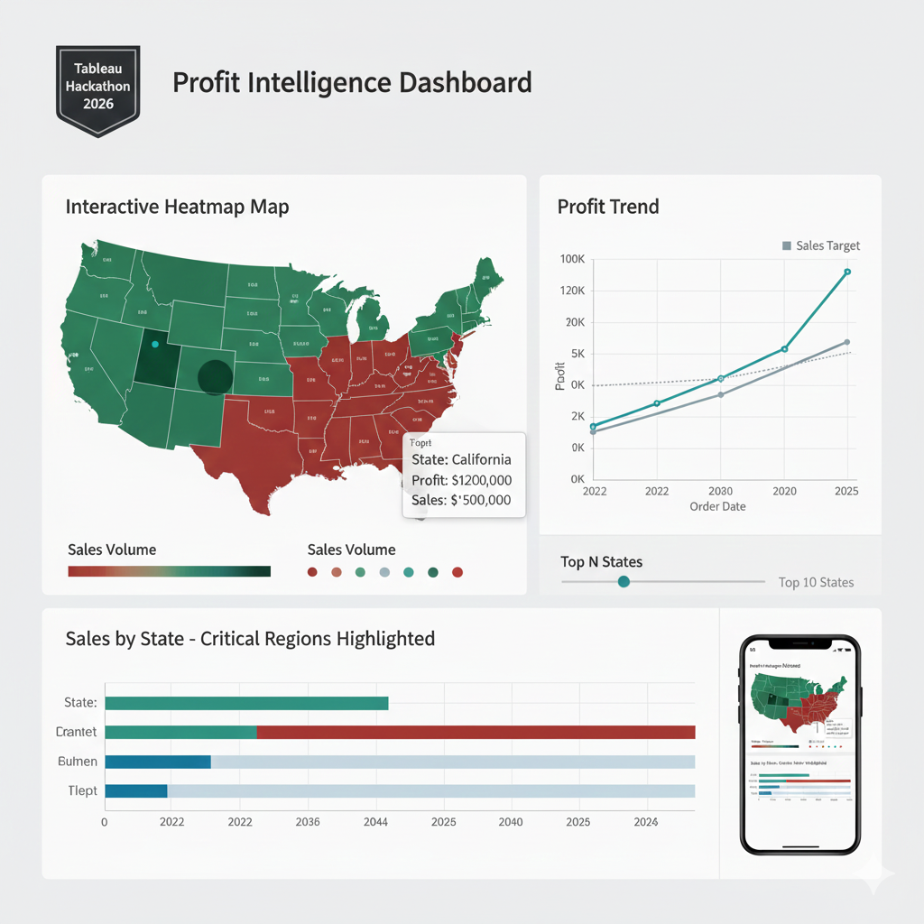 The Profit Intelligence Dashboard provides an interactive heatmap visualization of sales performance across US states. It uses color coding (blue/green for profit, red for losses) and size encoding (larger circles for higher sales) to convey multiple data dimensions at once. Users can click any state to filter all connected charts, enabling drill-down analysis.