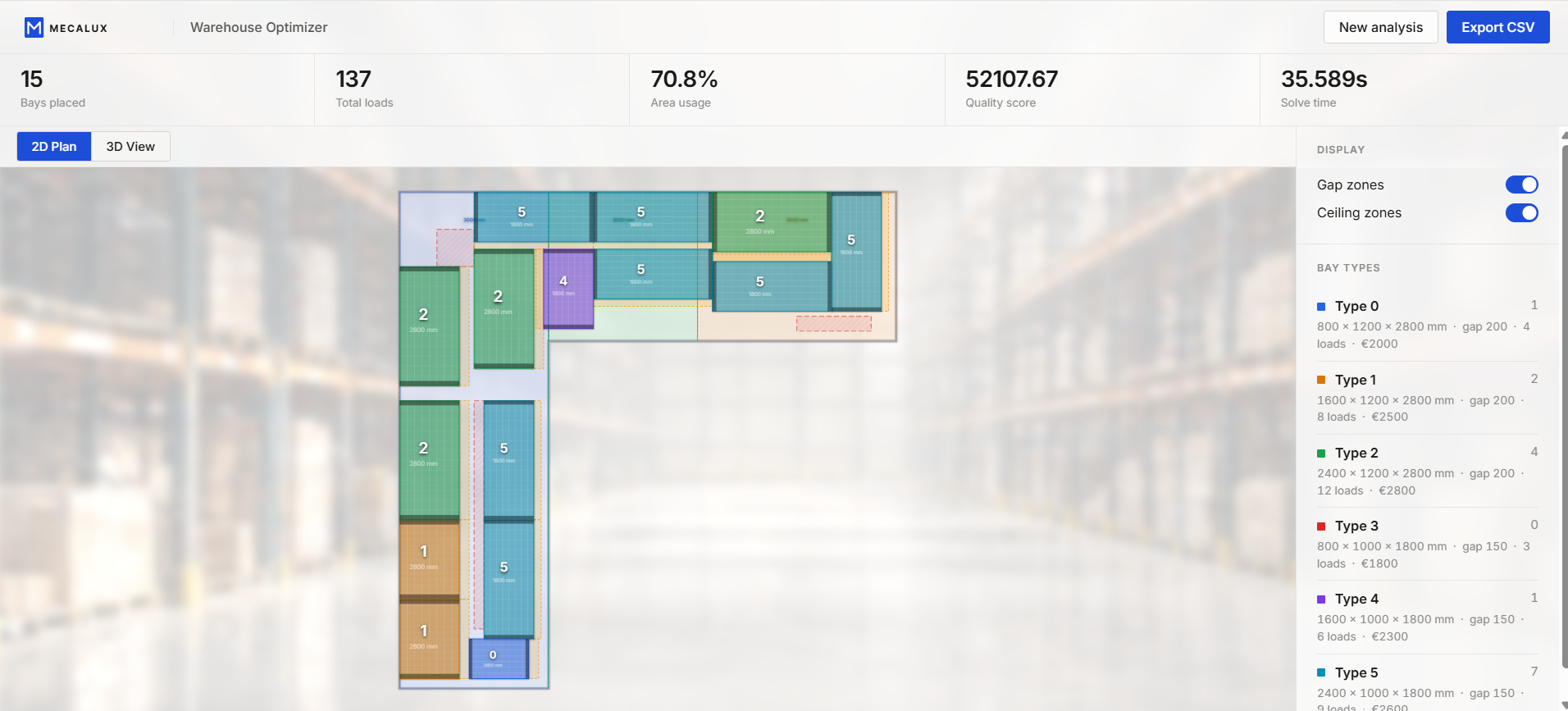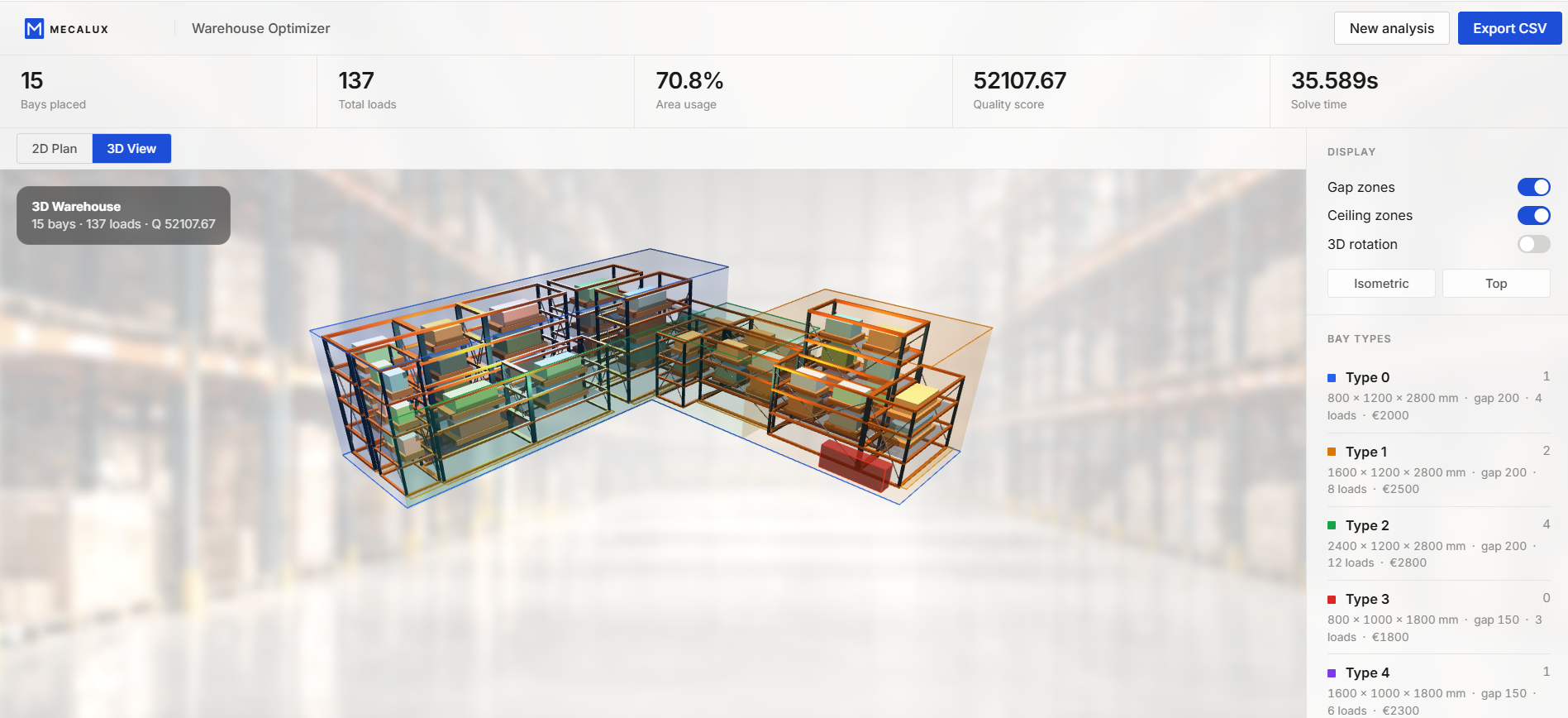 The algorithm first makes an initial solution in a greedy way as it is trying to minimize the costs by row while also maximizing space used and the loads obtained. Then it proceeds to do a local search in order to enhance this initial solution, where it tries a set of operators (add rack, remove rack, change one rack with another, etc.). It also has a random component added to it (LNS) which is capable of removing an entire region of the space and rebuilding it again with the said operators so that we can escape local minimums. Then we've also made a representation of the 2d space and the 3d space in a web so that the whole process can be more visual.