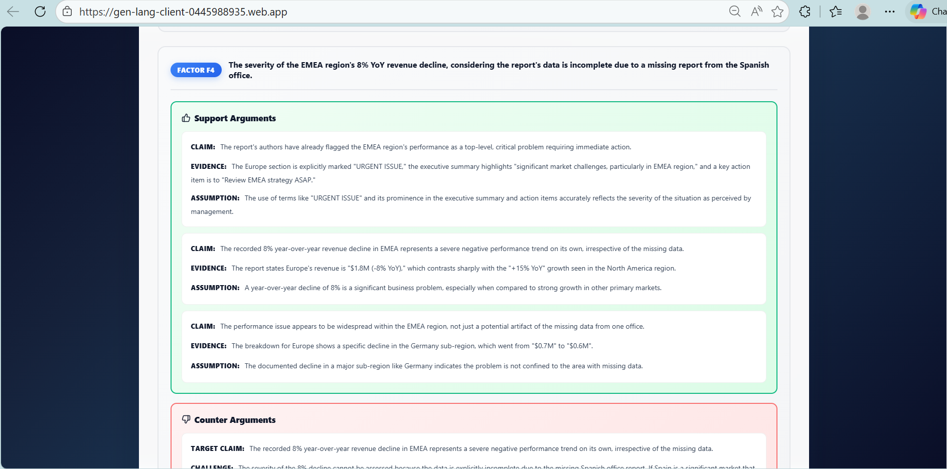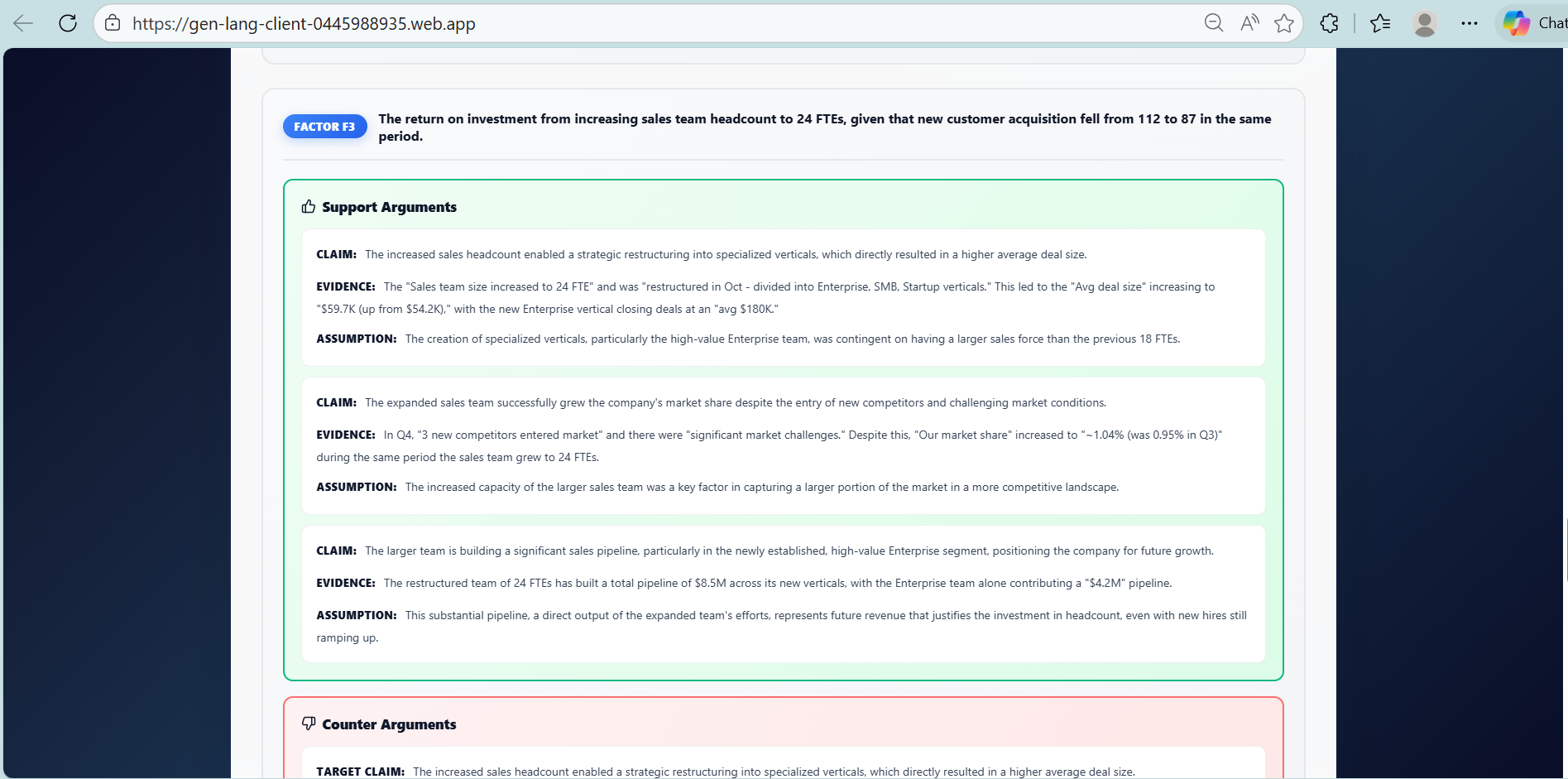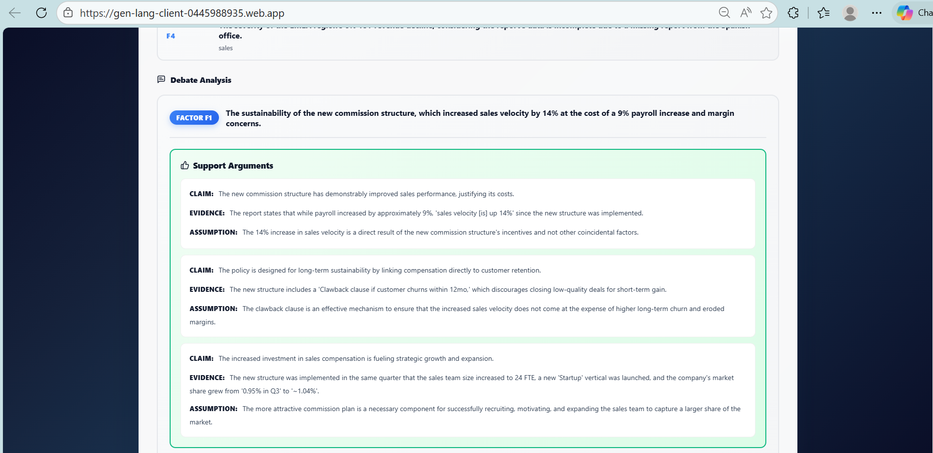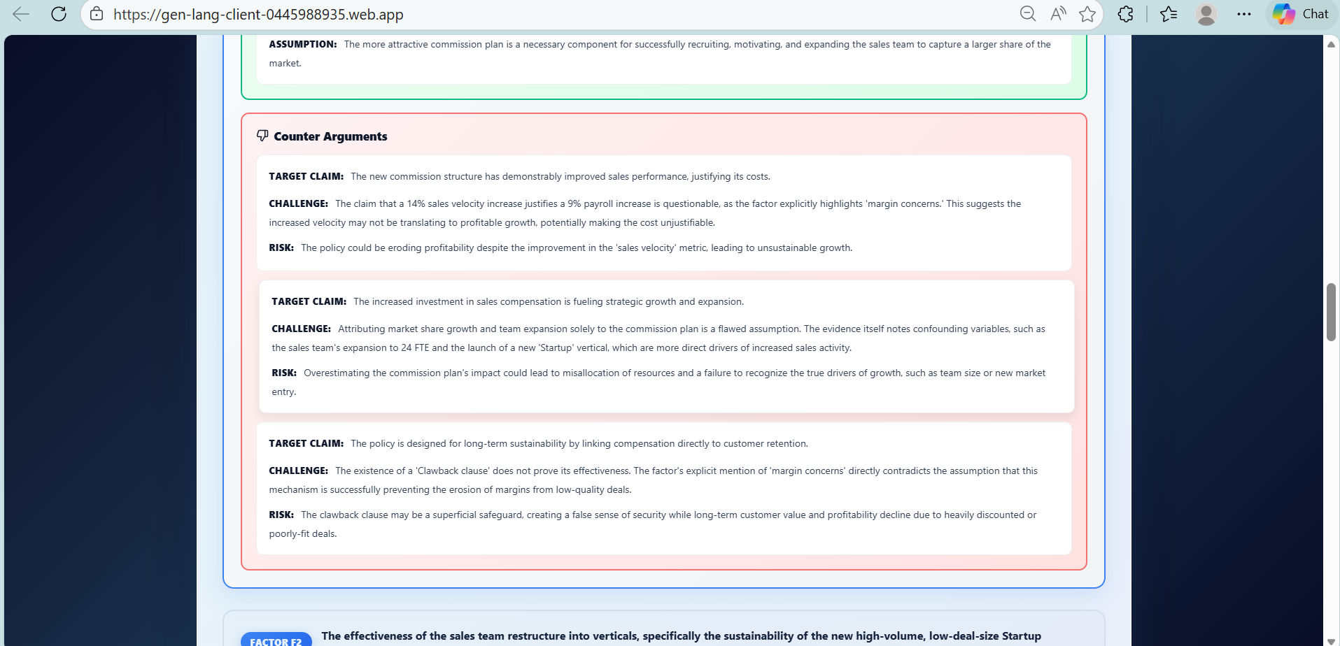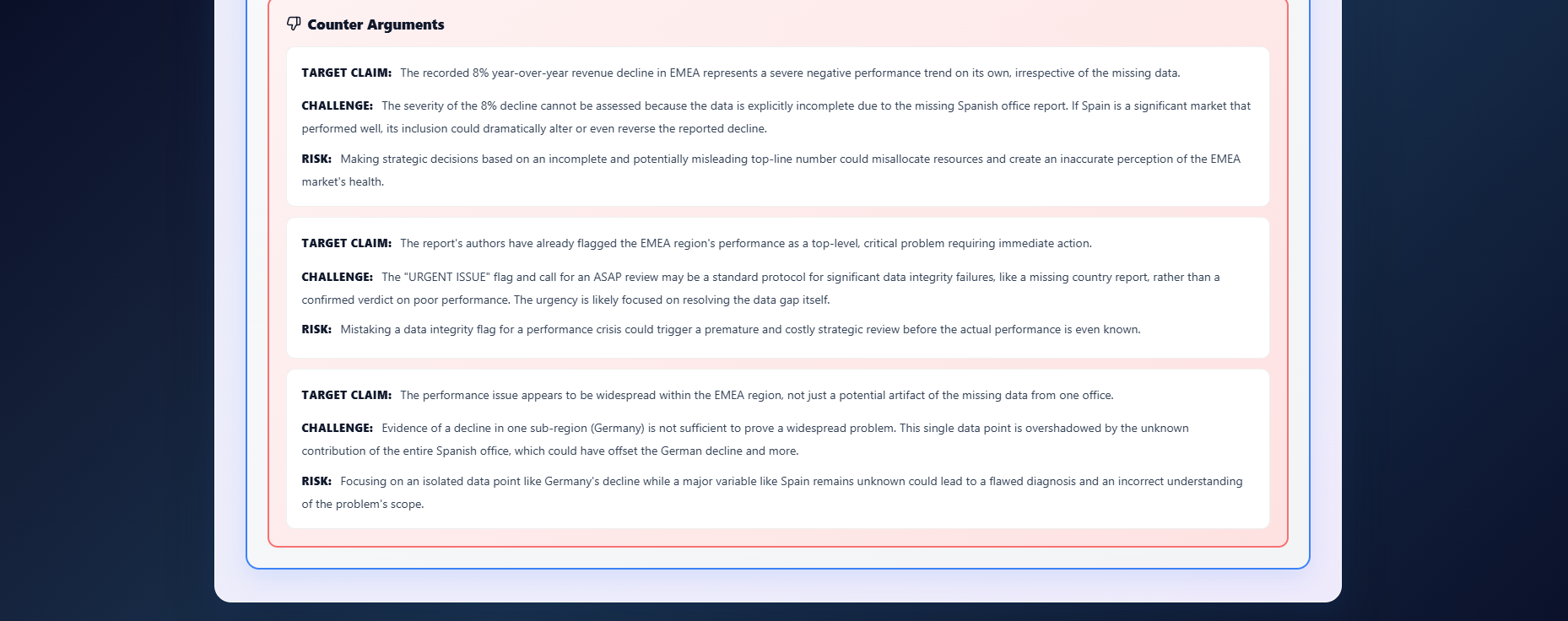 Debate quality control Some counter-arguments were weak or generic. We refined prompts to require targeted challenges, evidence-based reasoning, and risk assessment.