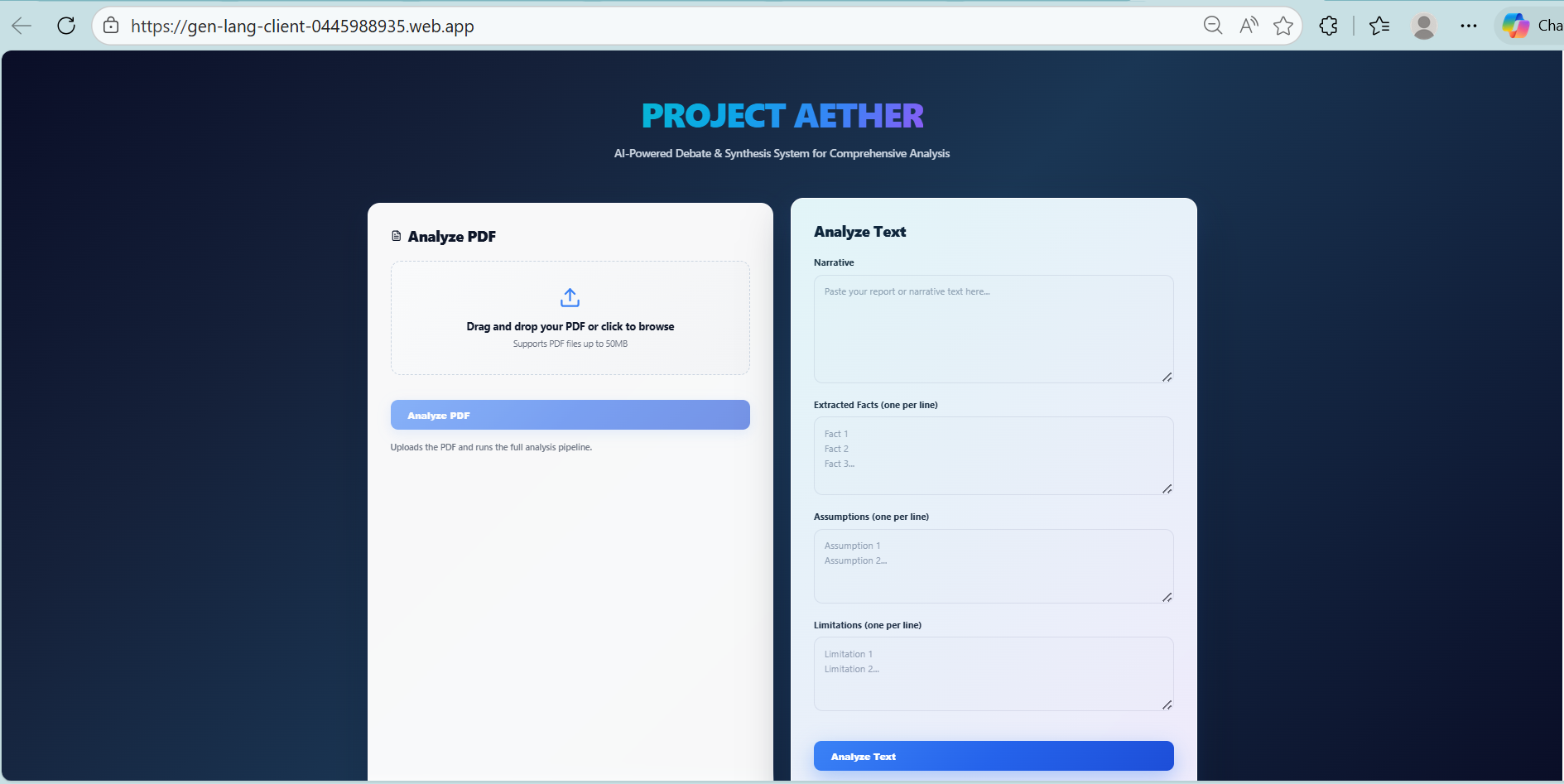 What inspired us to build Project AETHER was the critical need for transparent, multi-perspective analysis in decision-making processes. Traditional AI systems often provide single-perspective recommendations without exploring counterarguments or alternative viewpoints. We wanted to create a system that mimics the Socratic method of debate, where every claim is challenged, evidence is scrutinized, and synthesis emerges from structured opposition.