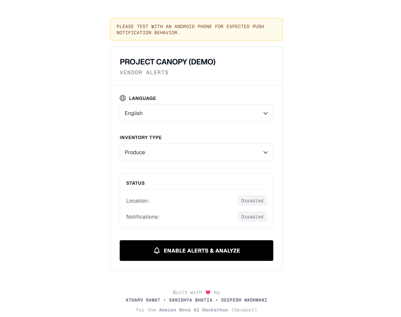 A vendor opens Canopy, taps one button, and selects what they're selling. Within seconds they get a heatwave risk assessment tailored to their specific inventory. Not just a generic temperature reading, but actionable guidance. A produce vendor gets different advice than a clothes seller or someone running a fried snacks stall.