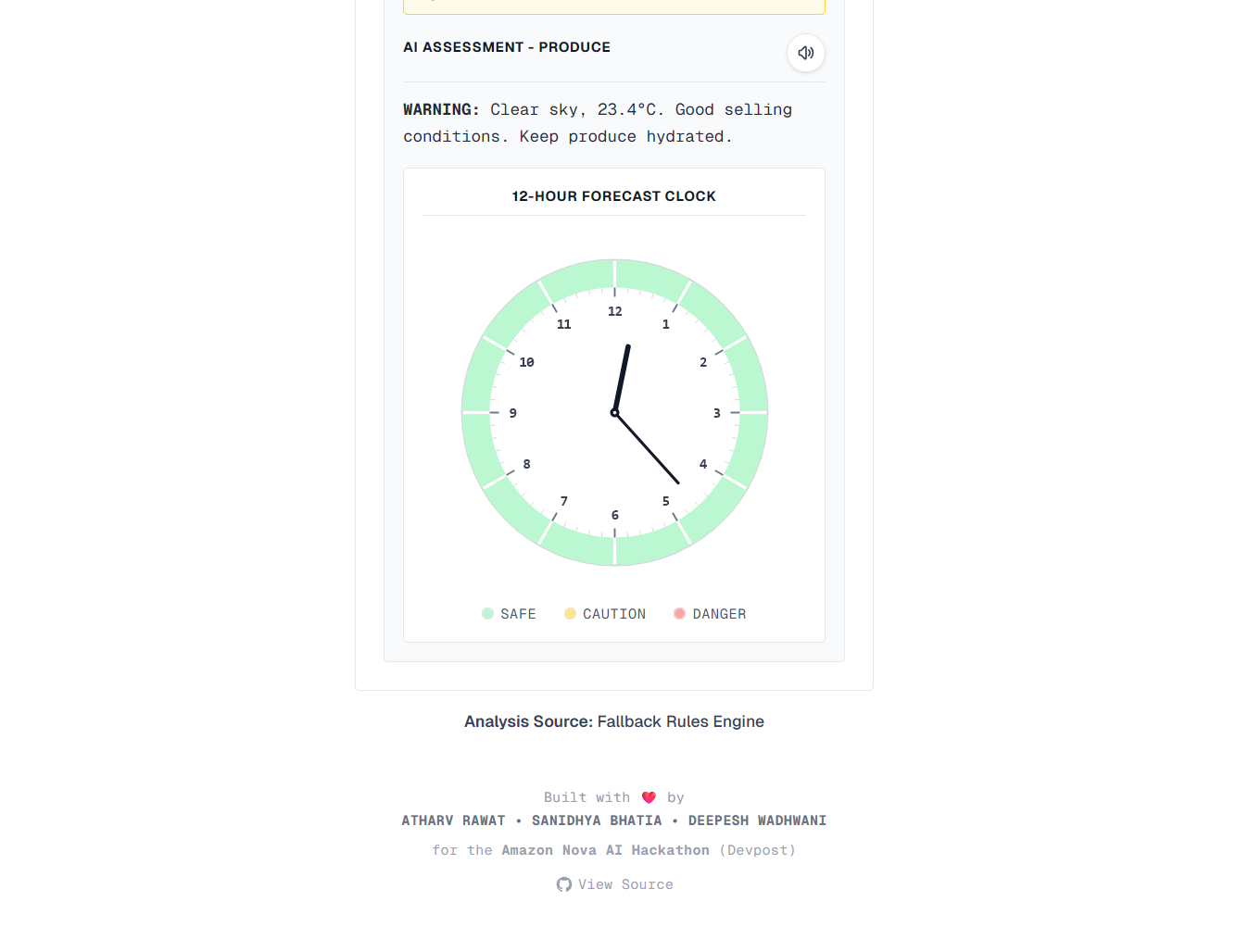 Vercel's deployment constraints ruled out the Python packages our full pipeline depends on. We responded by building a lightweight Edge API fallback that delivers real, inventory-specific guidance using live weather variables, so vendors always get actionable output regardless of backend state. This constraint made us appreciate the contributions of the AI layer, and that clarity improved the whole system.