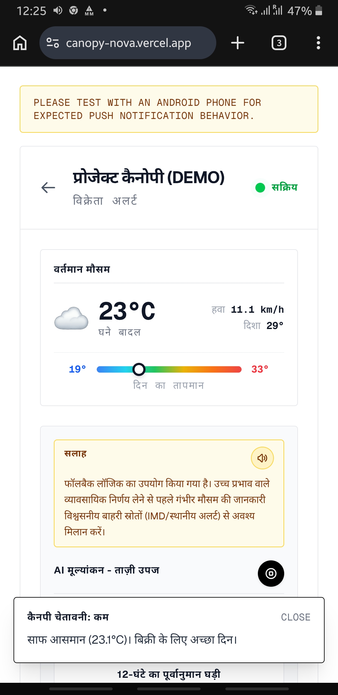 We noticed that the infrastructure gap is closing faster than people realise. Affordable smartphones and data plans mean more vendors are connected than ever. UPI has transformed how they earn, making digital payments straightforward and giving millions a stable livelihood. Our app is built to protect that livelihood. If they already have a phone and a way to get paid, Canopy gives them a way to make smarter decisions about when to show up, what to watch for, and when to pack up early.