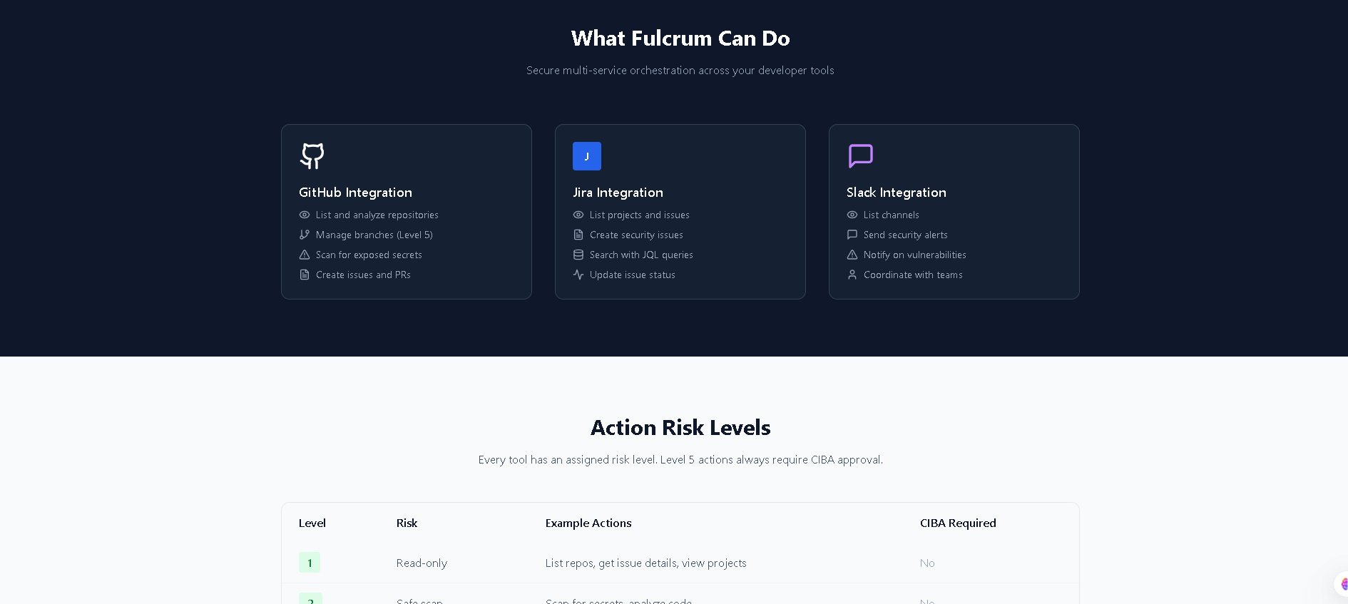 Fulcrum is a security auditing agent that orchestrates workflows across GitHub, Jira, and Slack without holding any permanent credentials. It demonstrates three core capabilities:
