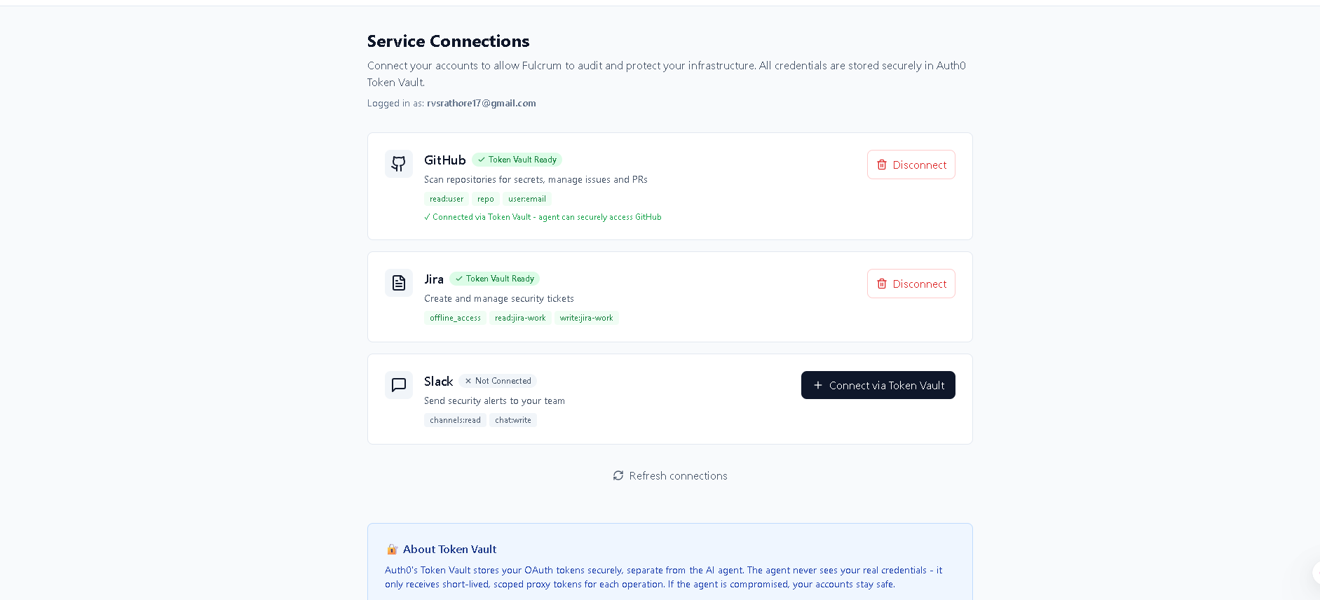 Zero-Trust Credential Management: Instead of storing tokens in .env files, Fulcrum uses Auth0 Token Vault to exchange refresh tokens for short-lived, scoped access tokens at runtime. If the agent process is compromised, an attacker gains nothing—only useless, expired tokens.