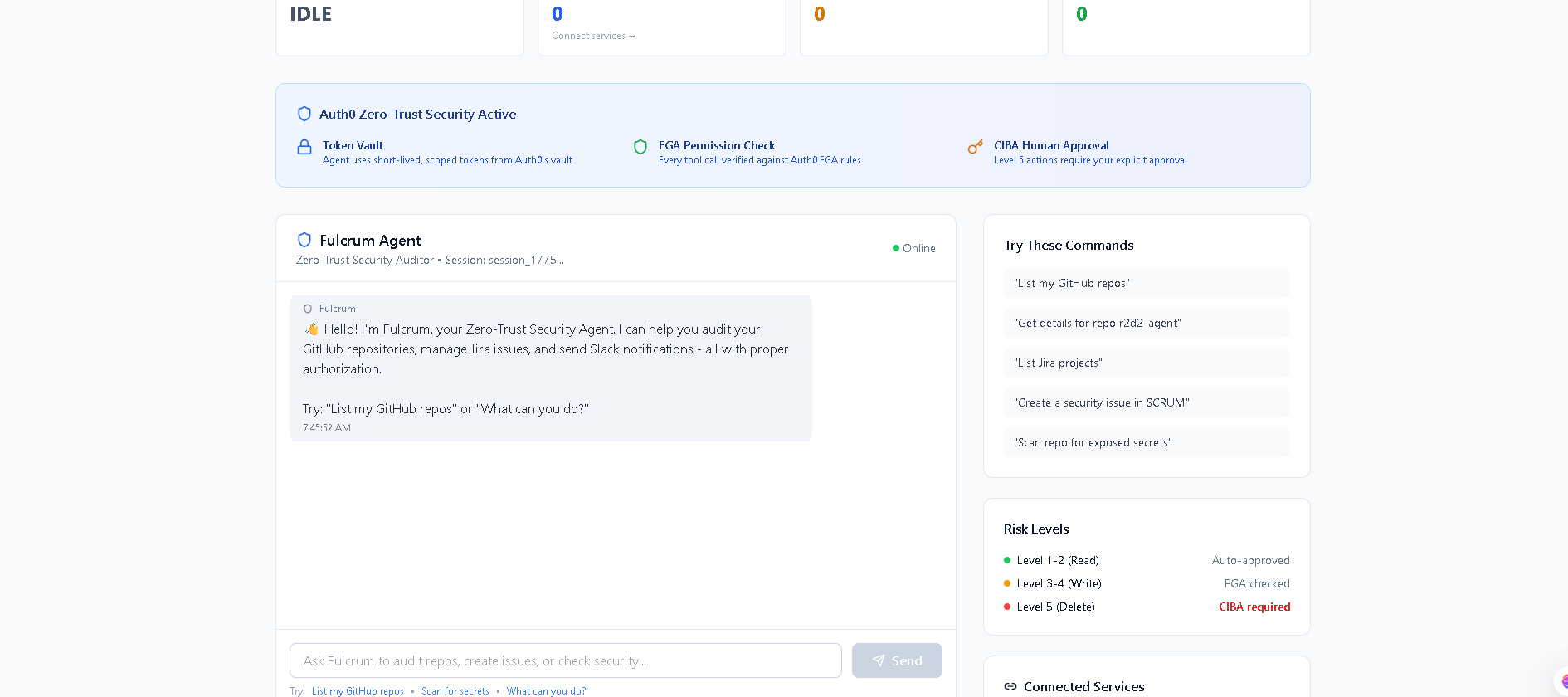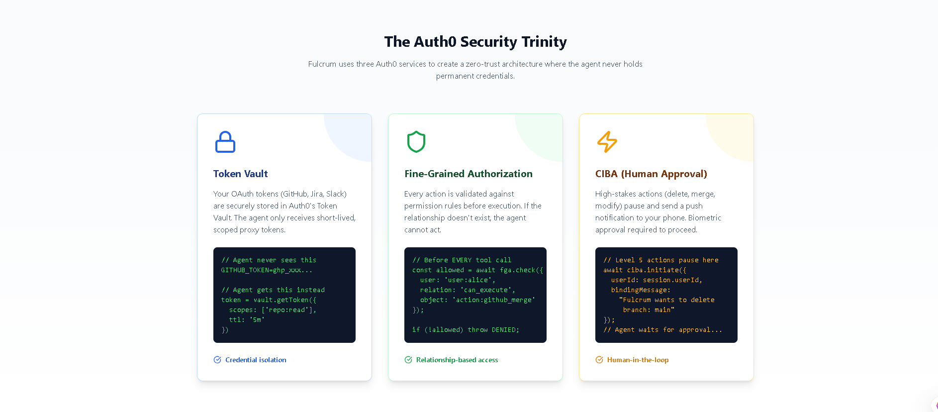 CIBA Human Approval Layer: For level 5 actions, we initiate an Auth0 CIBA request. This sends a push notification to the user's phone, asking "Fulcrum wants to delete branch: main. Approve?" The user responds with biometric authentication. The agent waits for approval before proceeding.