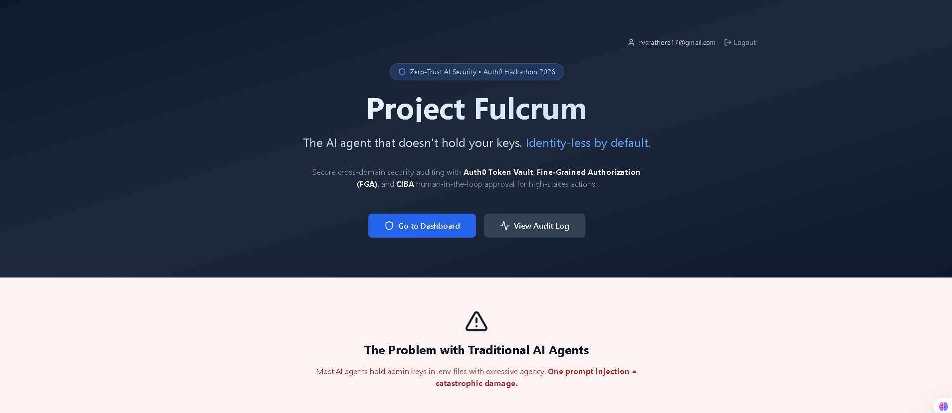 Building Fulcrum started with a simple but unsettling realization. After recent supply-chain incidents like the npm axios-related compromises, I kept coming back to one question: why are we still giving AI agents permanent, high-privilege tokens? Every tutorial I saw followed the same pattern—store secrets in .env, grant full access, and trust the system won’t break. That didn’t feel like engineering; it felt like gambling.