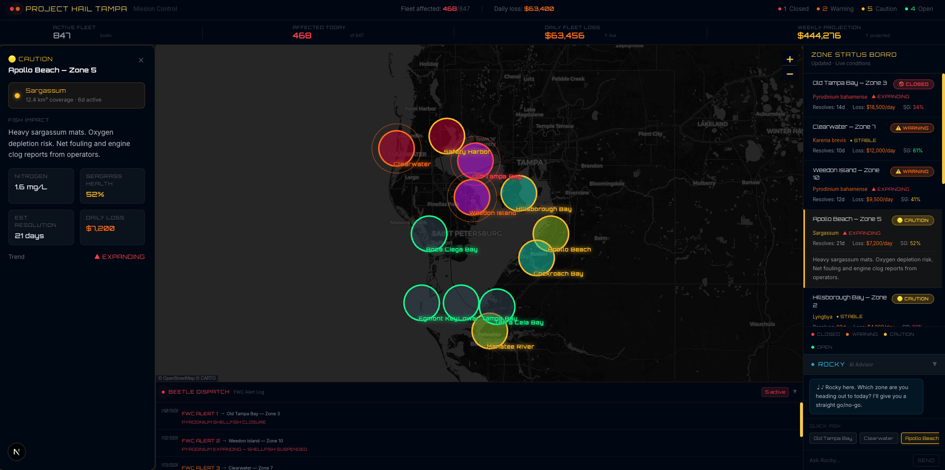 Tampa Bay commercial fishing boats lack reliable, real-time data to determine if a target zone is safe, leading to significant financial losses from dead catches and fouled engines. Project Hail Tampa was built to provide a "Mission Control" that transforms fragmented environmental data into actionable intelligence for every operator.