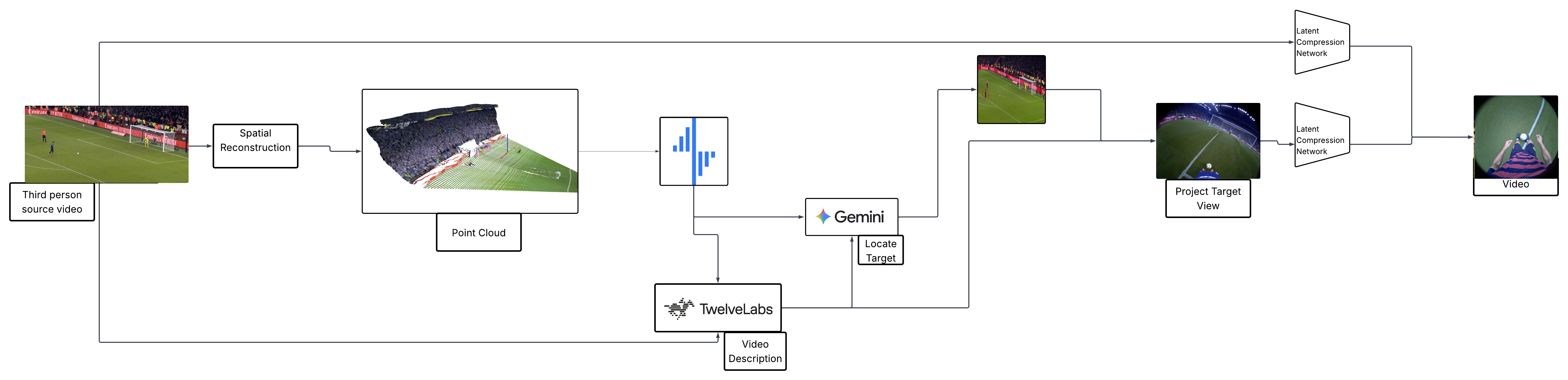 Video frames are sent to backboard.io, which routes them to Gemini and TwelveLabs to generate structured scene descriptions and identify the target subject and intended first-person viewpoint.Depth-Based Prior Rendering