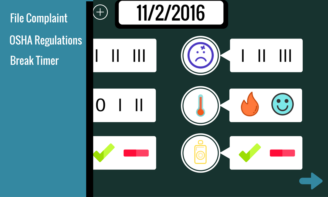So what is OSHApp? OSHApp is a tool designed to connect and empower workers and crew leaders. The web app consists of several different pages. At the heart of the app is the daily check in. The daily check in is a quick survey consisting of several questions about employee health during work. Data entered by workers, such as number of bathroom breaks, whether they've eaten, heat levels, will be sent to crew leaders and farm managers so that policies can be better designed and implemented for the betterment of the farm ecosystem. In addition to the daily check in, employees may also access a "File a complaint" page. At the moment, one of the main challenges the customers discussed was helping cultivate motivation in laborers to reach out when they are facing obstacles in the workplace, so we believe providing a one stop, quick entry complaint page which can be relayed to the crew leaders will eliminate a lot of these problems. In addition, there is also an OSHA regulations page, which we want to utilize to simplify OSHA regulations in a easy to understand manner so workers are fully aware of their rights. Lastly, the web app features a break timer. Another problem that farm managers relayed to us was the difficulty of ensuring users take breaks. Whether implemented anonymously or not, the break timer could help crew leaders track average break time and whether people are meeting break requirements as well as giving workers the power to track their breaks.