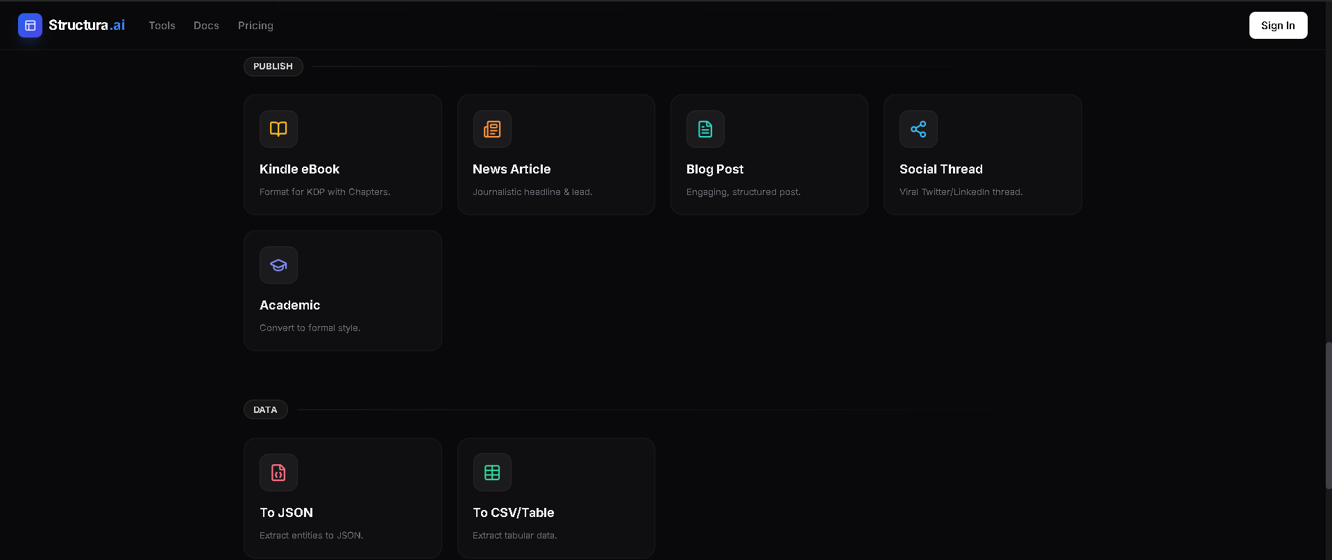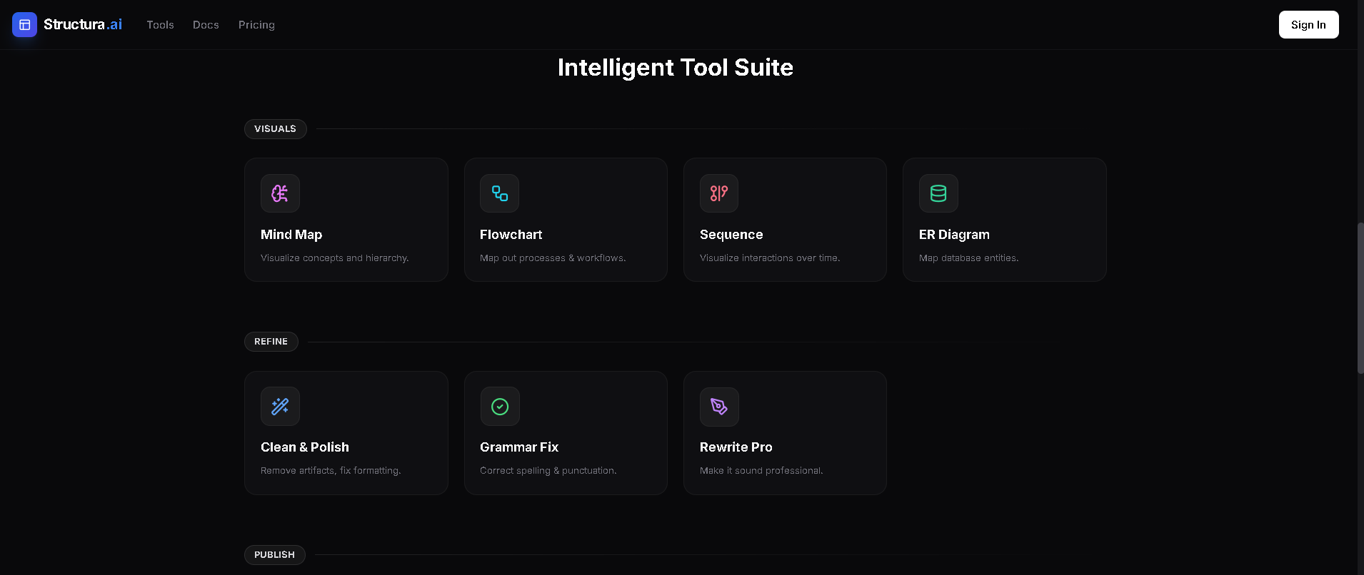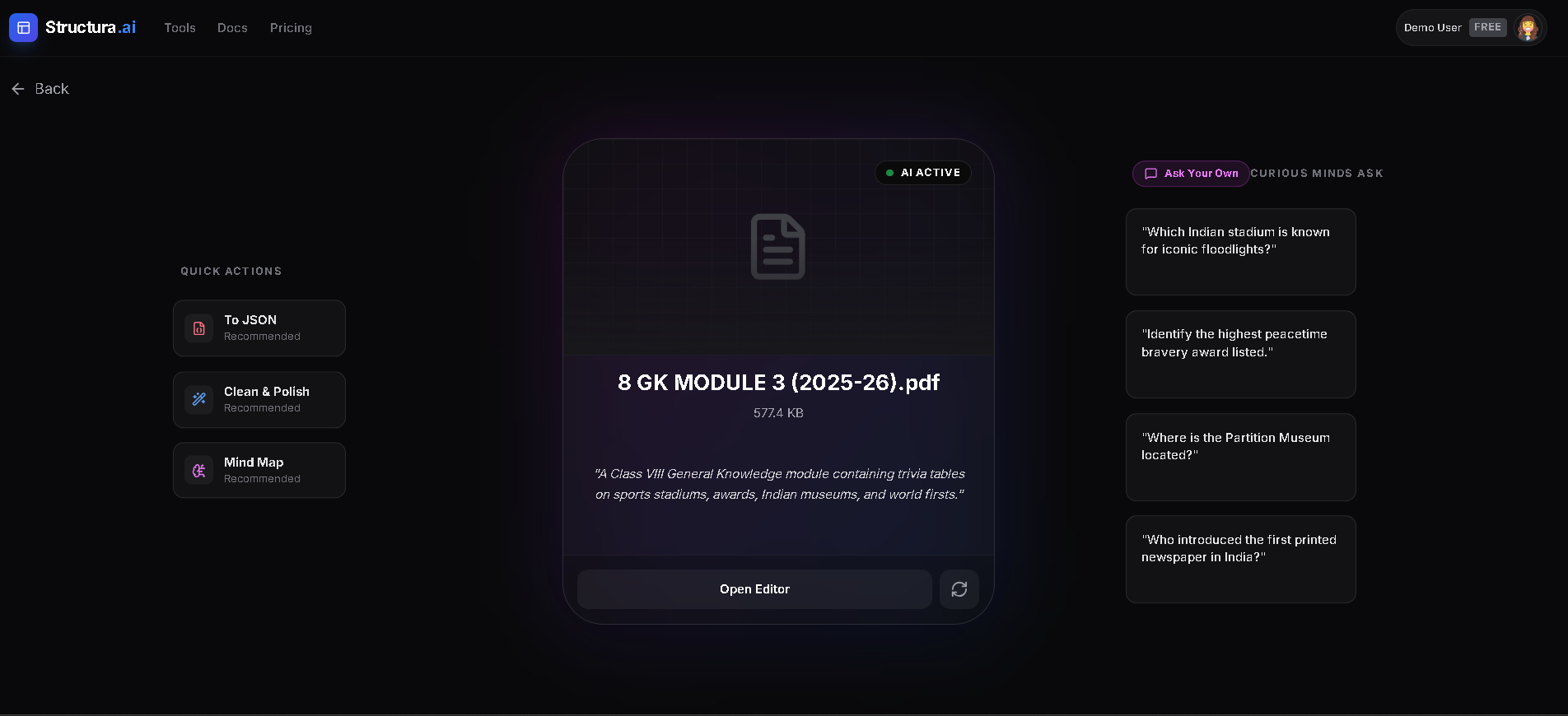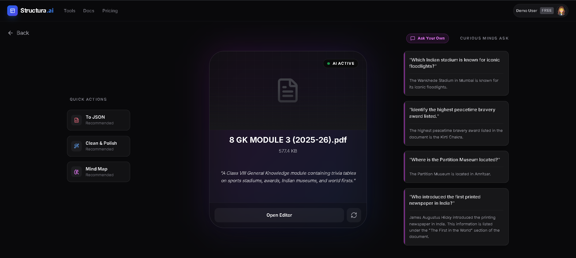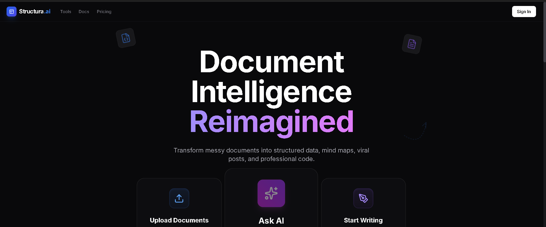 Structura AI transforms documents (PDFs, DOCX, Images, Code) into structured data and visual formats. It offers specific tools for: Refinement: Grammar fixing and professional rewriting. Visualization: Generating automatic Flowcharts, Mind Maps, and ER Diagrams. Data Extraction: Converting text to strict JSON or CSV. Ask AI: A flagship mode to chat with documents, generating deep insights and suggested questions.