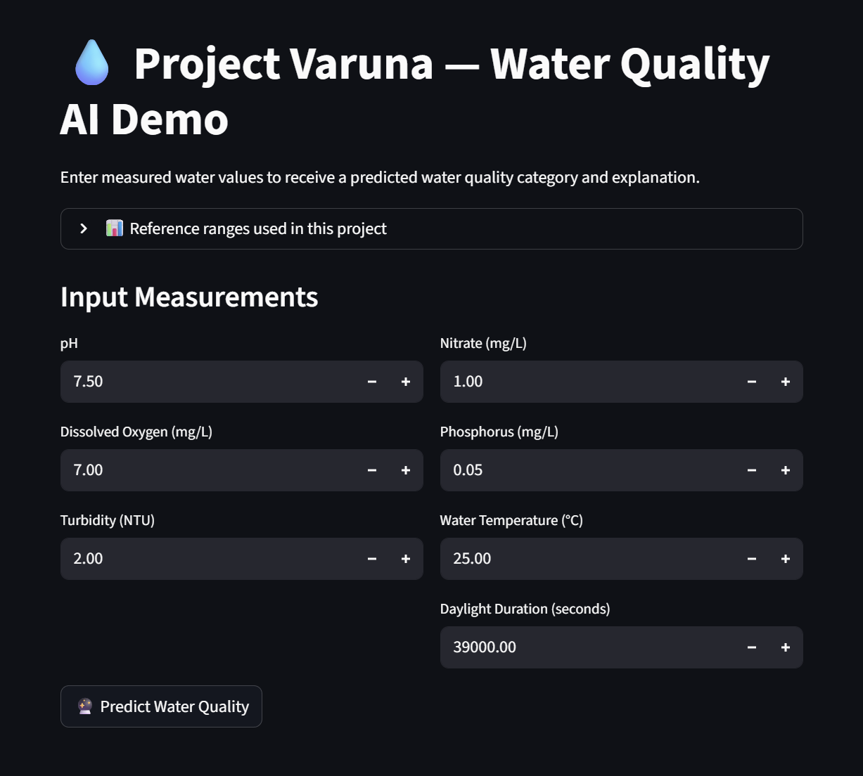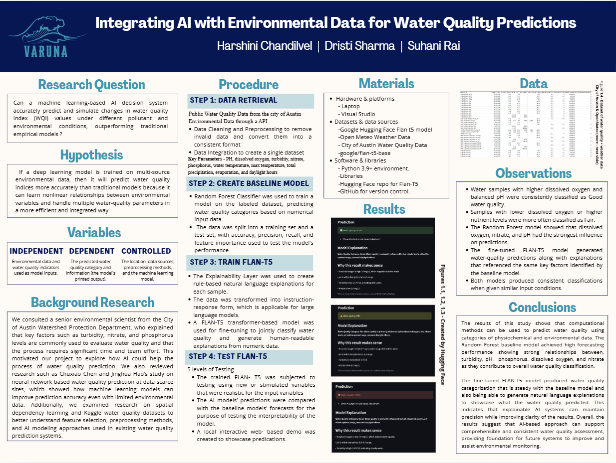 Procedure Data Collection Data used in this study was collected from publicly accessible water quality sampling datasets, OpenMeteo for weather and City of Austin for water quality.. The datasets included physicochemical parameters such as pH, dissolved oxygen, turbidity, nitrate, phosphorus, and water temperature. Environmental data was collected from publicly accessible weather data sources. Environmental data included daily environmental parameters such as daylight duration and temperature. No physical samples, chemicals, or biological materials were used. Data Cleaning and Preprocessing The data cleaning of the water quality dataset involved the removal of invalid data, standardization of the columns, and filtering of the data based on parameters that are of interest in the assessment of water quality. The data was also transformed from a long format to wide format so that each sample of water corresponds to a single row with multiple columns. The data cleaning of the environmental dataset involved the removal of metadata, standardizing column names,converting dates into a consistent format, and eliminating duplicate entries. When new environmental data was obtained, the old and new data was combined programmatically. Dataset Integration The cleaned water quality and environmental datasets were integrated based on their common key, which was the sampling dates. This led to the creation of a single dataset that contained both water quality and environmental data. The data was made consistent by keeping only those records that had overlapping dates. Water Quality Index (WQI) Labeling A Water Quality Index-based system of categorization was also implemented using scientific thresholds for important parameters like pH, dissolved oxygen, turbidity, and nitrate concentration. A sub-score was assigned to each parameter depending on the range within which it fell—optimal, moderate, and poor ranges. A water quality category was assigned by summing up the sub-scores for each parameter. This process of labeling the water samples with categories was used for machine-learning training. Baseline Machine Learning Model A Random Forest classifier was used to train a model on the labeled dataset, predicting water quality categories based on numerical input data. The data was split into a training set and a test set, with accuracy, precision, recall, and feature importance used to test the model's performance. The feature importance values helped identify significant water quality drivers, such as dissolved oxygen, nutrient concentration, and pH. Explainability Layer The results obtained from the feature importance of the baseline model were utilized to generate rule-based natural language explanations for each sample. These explanations described the reason for the sample’s classification into a particular category based on scientifically relevant factors, such as low levels of dissolved oxygen and high levels of nitrates. AI Model Fine-Tuning (FLAN-T5) The data was transformed into instruction-response form, which is applicable for large language models. In this case, the instructions were related to numeric water quality and environmental measurements, while the responses included water quality categories and explanations. A FLAN-T5 transformer-based model was used for fine-tuning to jointly classify water quality and generate human-readable explanations from numeric data. Model Testing and Demonstration The trained FLAN-T5 model was subjected to testing using new or simulated realistic values for the input variables. The goal of the testing was to assess the model’s ability to generalize the predictions. The AI model’s predictions were compared with the baseline model predictions for the purpose of testing the interpretability of the model. A local interactive web-based demo was developed.