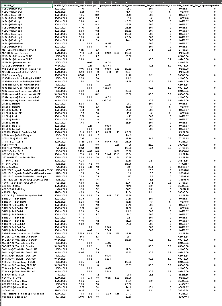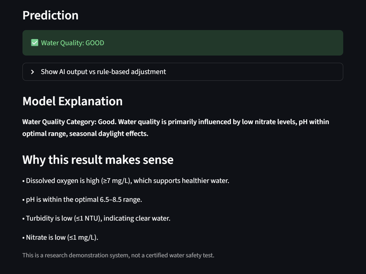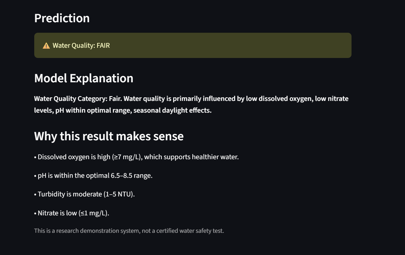 Procedure Data Collection Data used in this study was collected from publicly accessible water quality sampling datasets, OpenMeteo for weather and City of Austin for water quality.. The datasets included physicochemical parameters such as pH, dissolved oxygen, turbidity, nitrate, phosphorus, and water temperature. Environmental data was collected from publicly accessible weather data sources. Environmental data included daily environmental parameters such as daylight duration and temperature. No physical samples, chemicals, or biological materials were used. Data Cleaning and Preprocessing The data cleaning of the water quality dataset involved the removal of invalid data, standardization of the columns, and filtering of the data based on parameters that are of interest in the assessment of water quality. The data was also transformed from a long format to wide format so that each sample of water corresponds to a single row with multiple columns. The data cleaning of the environmental dataset involved the removal of metadata, standardizing column names,converting dates into a consistent format, and eliminating duplicate entries. When new environmental data was obtained, the old and new data was combined programmatically. Dataset Integration The cleaned water quality and environmental datasets were integrated based on their common key, which was the sampling dates. This led to the creation of a single dataset that contained both water quality and environmental data. The data was made consistent by keeping only those records that had overlapping dates. Water Quality Index (WQI) Labeling A Water Quality Index-based system of categorization was also implemented using scientific thresholds for important parameters like pH, dissolved oxygen, turbidity, and nitrate concentration. A sub-score was assigned to each parameter depending on the range within which it fell—optimal, moderate, and poor ranges. A water quality category was assigned by summing up the sub-scores for each parameter. This process of labeling the water samples with categories was used for machine-learning training. Baseline Machine Learning Model A Random Forest classifier was used to train a model on the labeled dataset, predicting water quality categories based on numerical input data. The data was split into a training set and a test set, with accuracy, precision, recall, and feature importance used to test the model's performance. The feature importance values helped identify significant water quality drivers, such as dissolved oxygen, nutrient concentration, and pH. Explainability Layer The results obtained from the feature importance of the baseline model were utilized to generate rule-based natural language explanations for each sample. These explanations described the reason for the sample’s classification into a particular category based on scientifically relevant factors, such as low levels of dissolved oxygen and high levels of nitrates. AI Model Fine-Tuning (FLAN-T5) The data was transformed into instruction-response form, which is applicable for large language models. In this case, the instructions were related to numeric water quality and environmental measurements, while the responses included water quality categories and explanations. A FLAN-T5 transformer-based model was used for fine-tuning to jointly classify water quality and generate human-readable explanations from numeric data. Model Testing and Demonstration The trained FLAN-T5 model was subjected to testing using new or simulated realistic values for the input variables. The goal of the testing was to assess the model’s ability to generalize the predictions. The AI model’s predictions were compared with the baseline model predictions for the purpose of testing the interpretability of the model. A local interactive web-based demo was developed.
