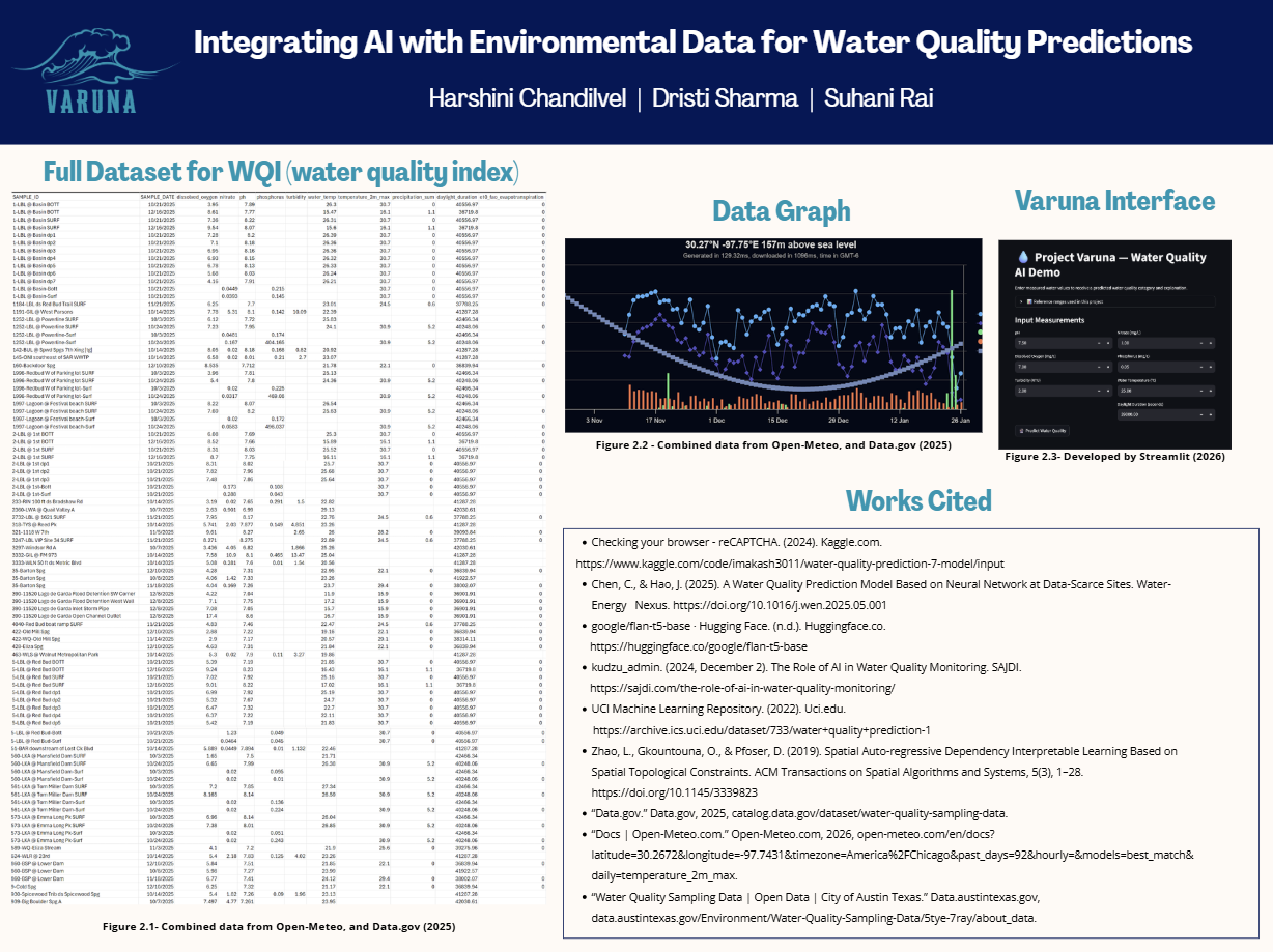 The understanding of probable issues or hazardous changes to water quality helps people identify risk areas and mitigate the possibility of impure water. Varuna: Integrating AI with Environmental Data for Water Quality Predictions will be accessible to all and will update frequently, minding climate change, and other unpredictable factors. Especially in Austin, Texas we have a wider breadth for data as our state is not usually prepared for drastically changing winter weather. AI can transform water quality monitoring by analyzing real time data, identifying patterns, and making predictions that enable more proactive water management. Varuna predicts water quality for Austin by getting weather data from the Austin area and the water quality variables- dissolved oxygen, nitrate, phosphorus, turbidity, water temperature, precipitation sum, daylight duration and evapotranspiration. These key factors helped drive the ai model we made to find and analyze patterns found in the data set involving these variables to predict whether or not the water quality is good, fair, or bad.