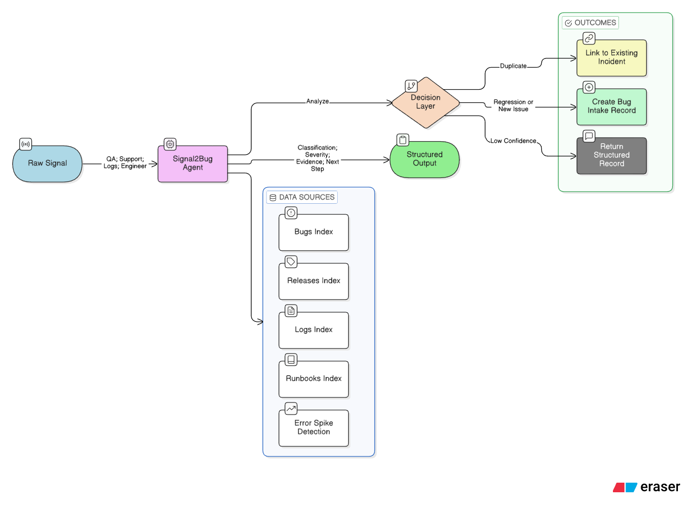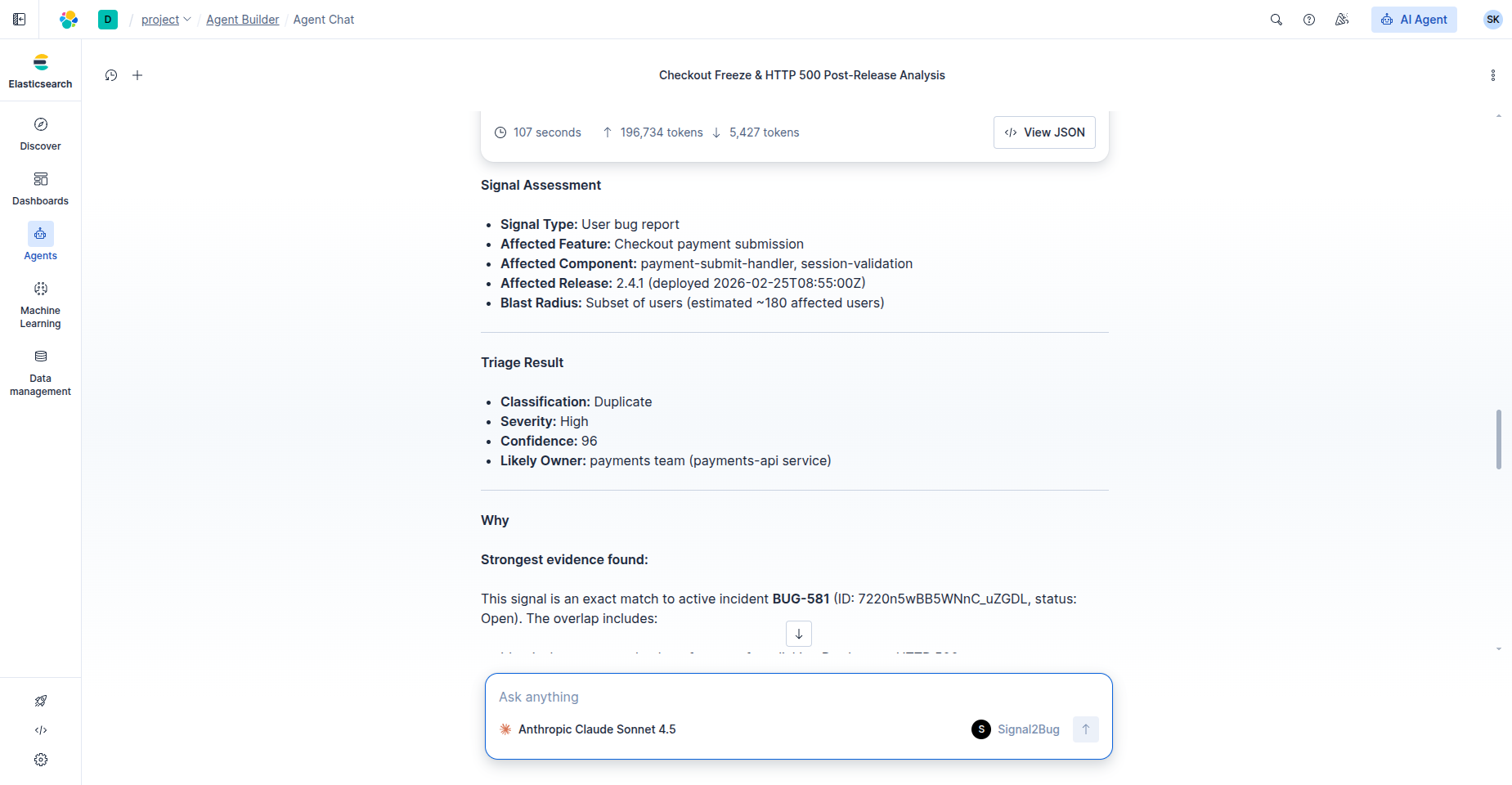 Signal2Bug addresses a common software delivery problem: new defects often arrive as incomplete, noisy signals from QA, support, logs, or engineers, and those signals must be manually normalized, correlated with recent deployments, checked against historical incidents, and rewritten into a structured bug record before engineering teams can act. This process is slow, repetitive, and error-prone, especially during post-release triage, when duplicate reports and missing context can delay incident response. The project solves this by turning raw operational signals into structured, evidence-backed bug intake records. It analyzes the signal, searches for related incidents, checks whether the issue correlates with a recent release, validates the pattern against operational logs, and recommends the safest next action. Elastic Agent Builder is well suited to this workflow because it combines LLM-driven reasoning with Elastic-native tools for retrieval, structured analysis, and controlled external actions.
