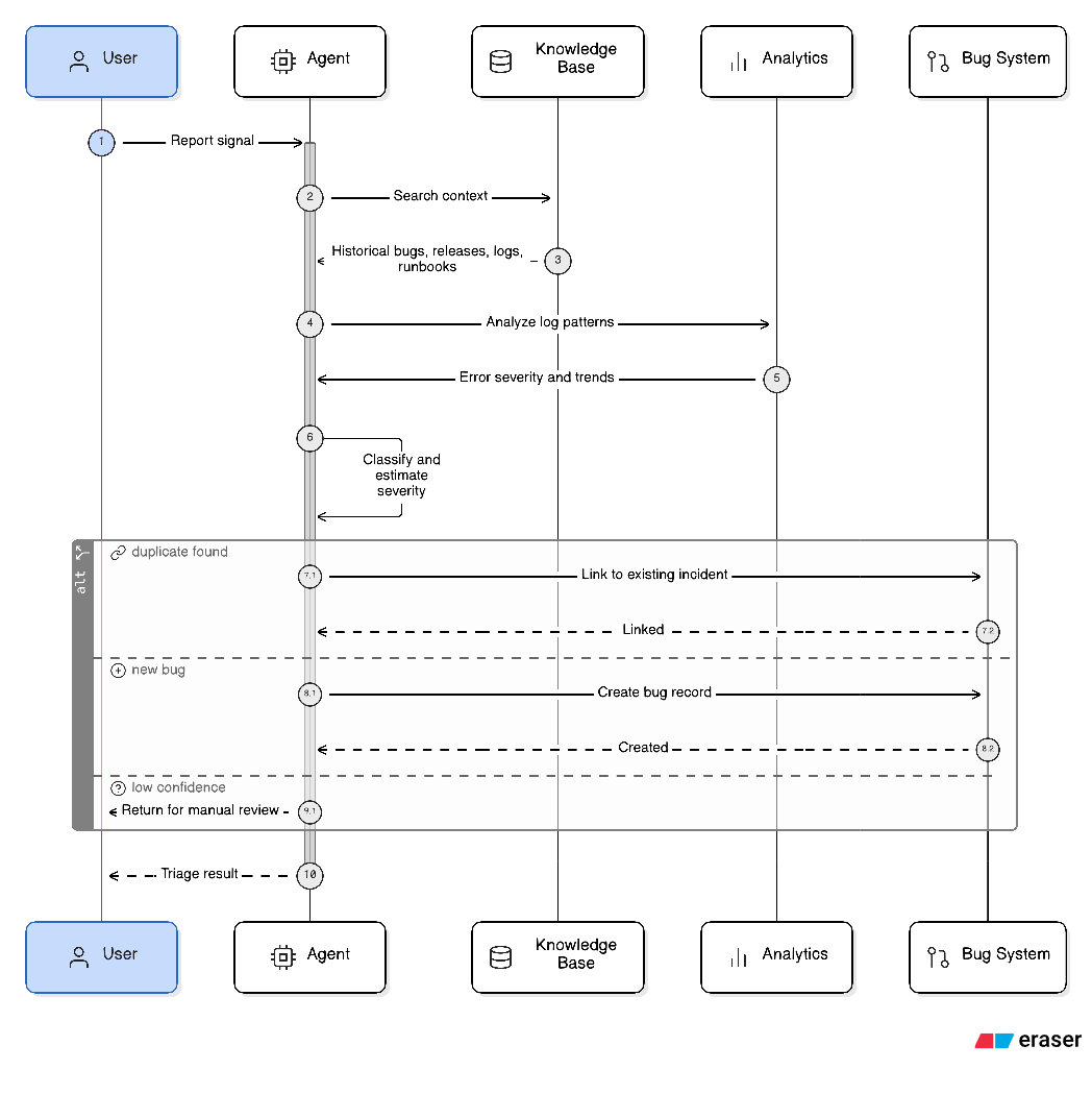 The main challenge was ensuring fast, high-quality bug triage without sacrificing safety or creating duplicate records, especially when signals were incomplete. It was also difficult to build a small but realistic demo dataset showing links between releases, logs, and incidents. Finally, I had to make sure the agent only saved records when truly confident and no similar incident existed.