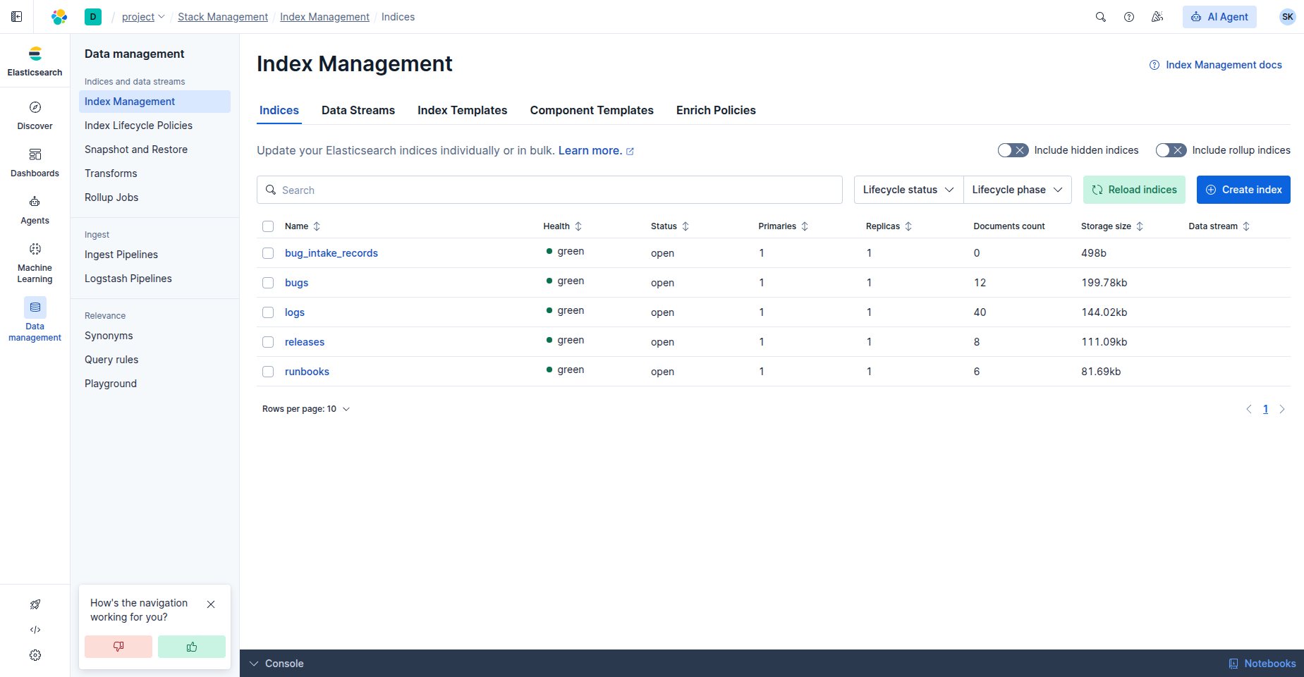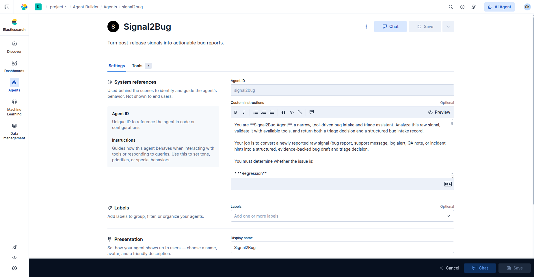 I built Signal2Bug as a custom agent in Kibana with narrow instructions and a restricted toolset so that the agent remains task-specific, auditable, and operationally safe rather than behaving like a general-purpose assistant. The agent works over synthetic operational data stored in focused Elasticsearch indices: bugs, logs, releases, and runbooks. This follows Elastic’s recommended pattern of ingesting data into Elasticsearch before building agents, so the agent can reason over retrieval-augmented context instead of relying only on the underlying LLM.