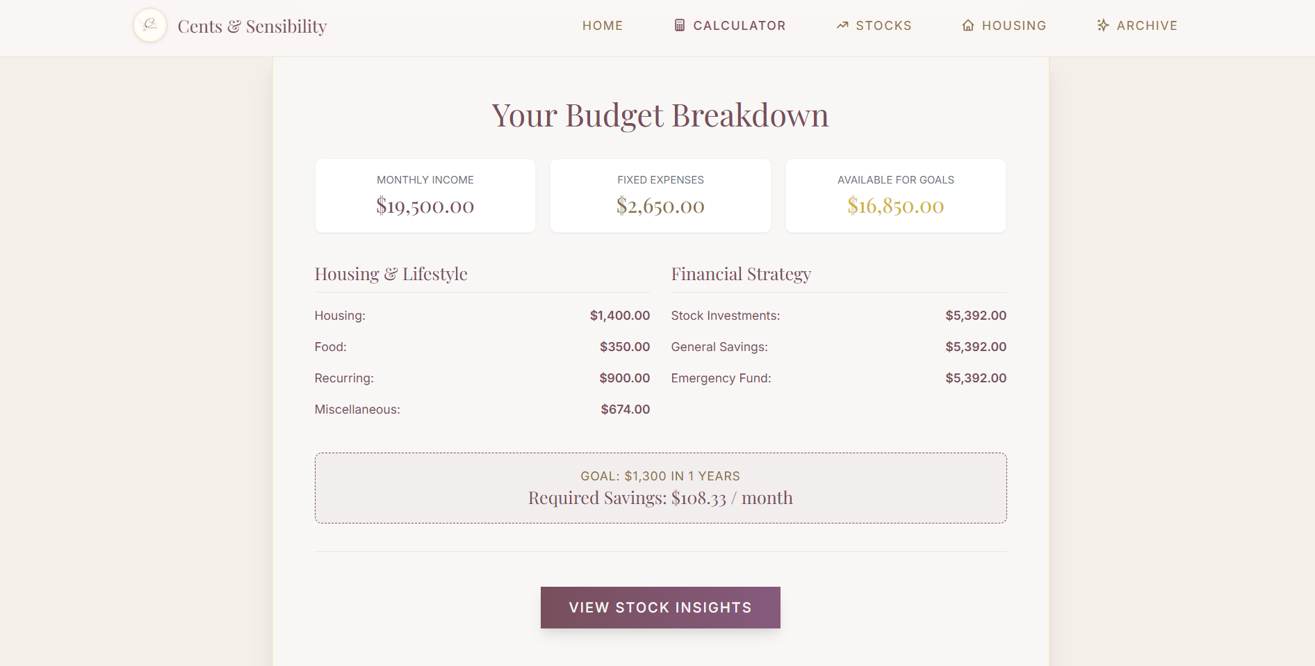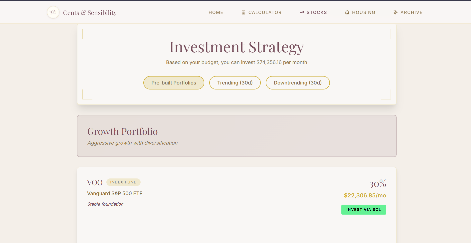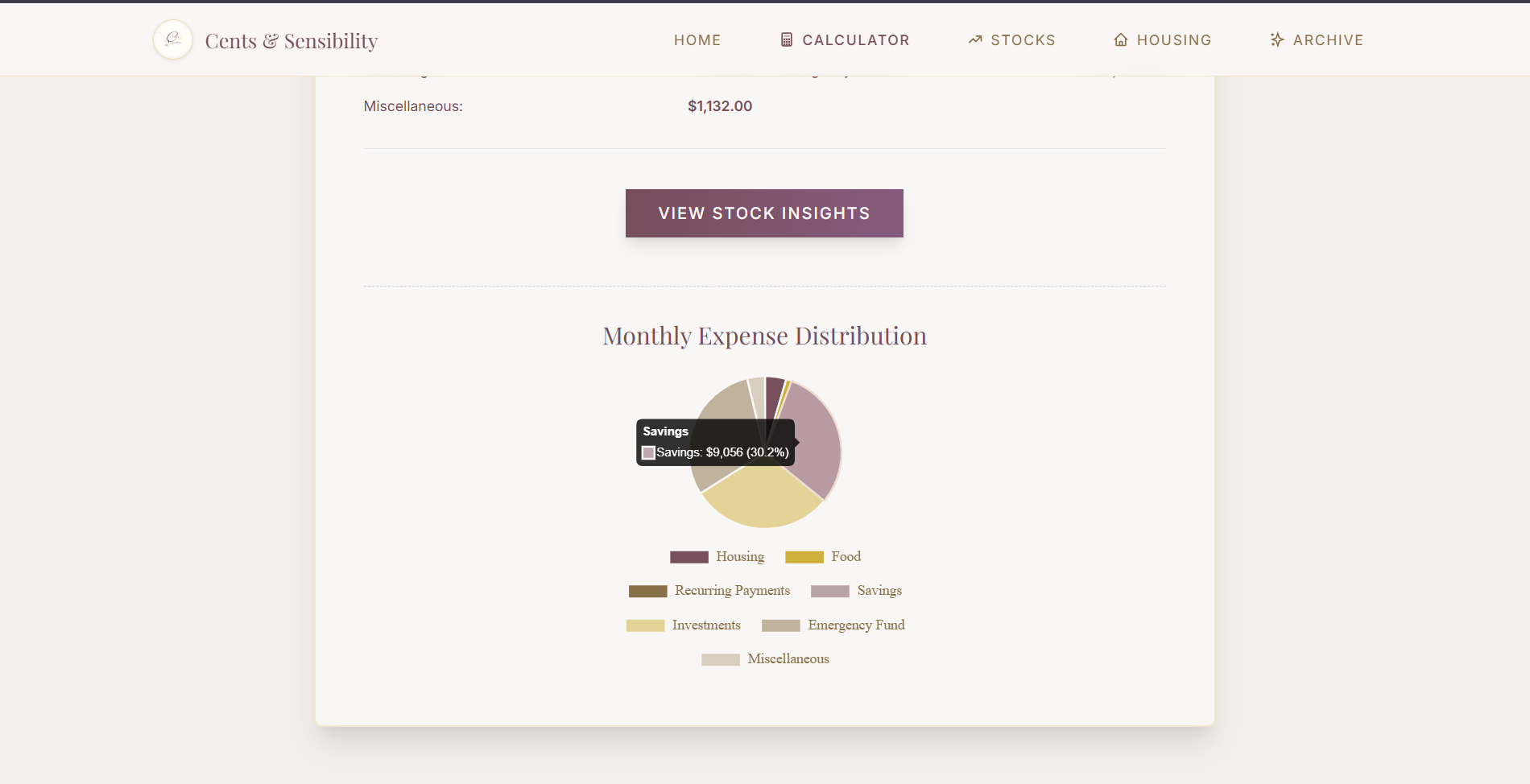 Unlike traditional budgeting applications that passively track past spending, Cents & Sensibility actively guides users in managing their finances. The platform begins by taking a user’s monthly salary and helping them allocate it across different categories, offering personalized recommendations on how much to spend, save, and invest based on their financial profile. It offers portfolios of what stocks to invest that depend on PEG ratios and that align with the user’s financial capacity and goals. It helps investors determine if a stock's high P/E is justified by its expected growth rate. A low P/E might look cheap, but if growth is zero, the PEG is high. It includes an AI-chatbot named Archive that provides general budgeting, savings, and investing advice for users who are just beginning to understand financial literacy. When showing the stocks, it provides a visual of trends and downtrends, and a historical background that identifies patterns of the companies' stocks. There is a tool called the Vault that offers users to search up products they want for brand deals as part of their budget and miscellaneous purchases. The platform also offers historical trends of