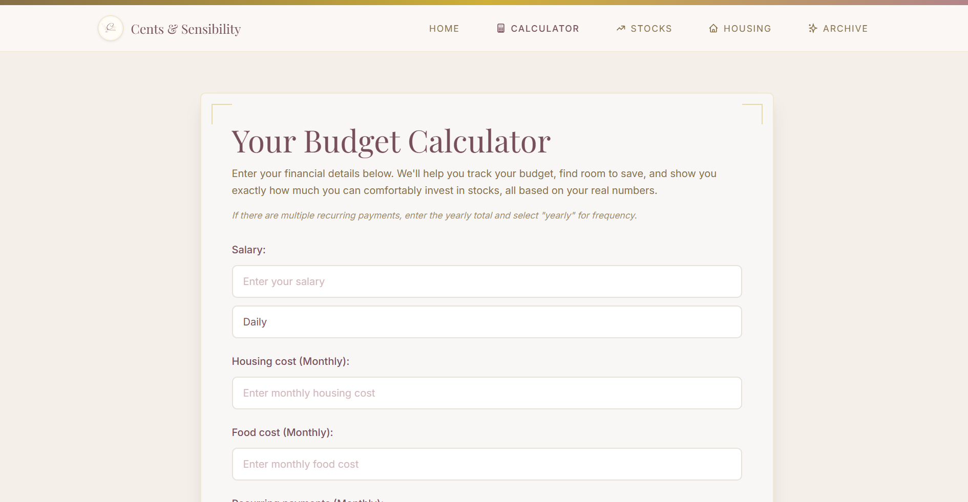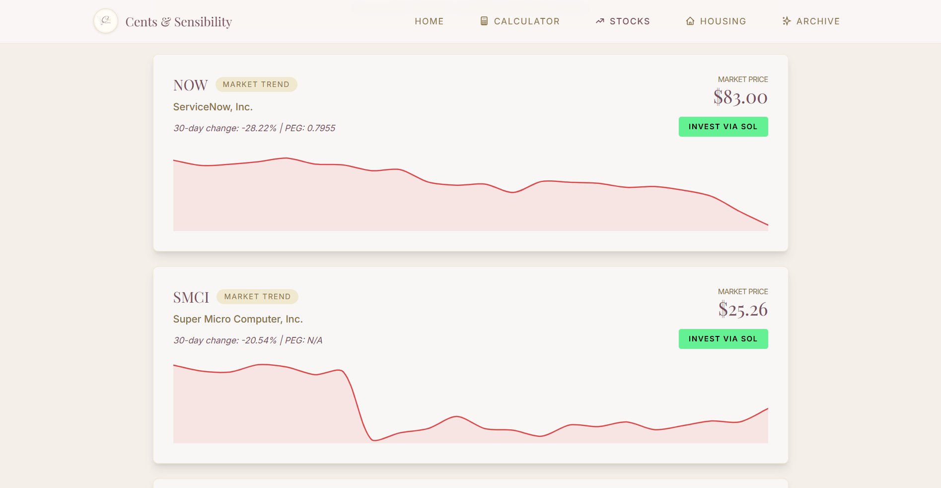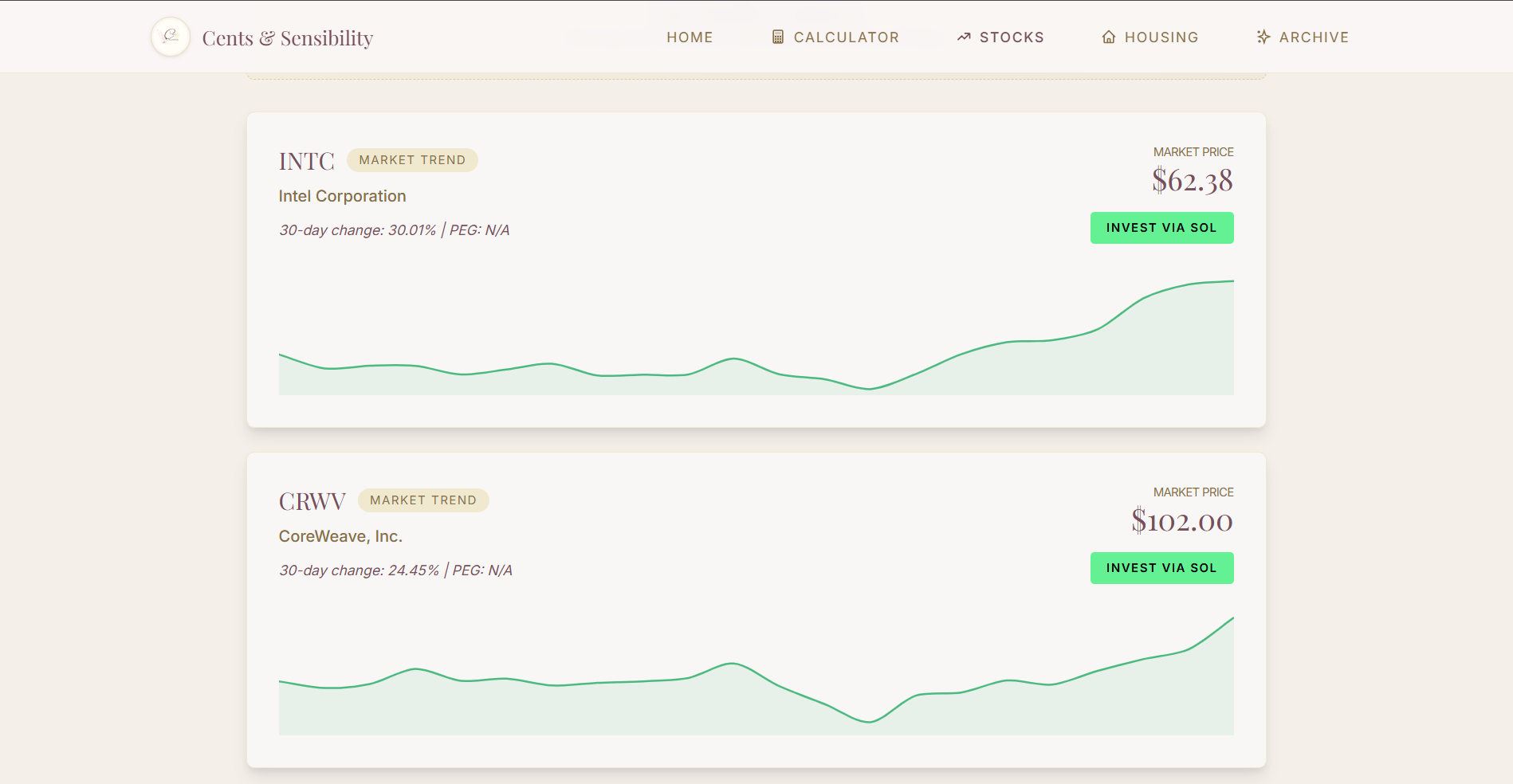 Unlike traditional budgeting applications that passively track past spending, Cents & Sensibility actively guides users in managing their finances. The platform begins by taking a user’s monthly salary and helping them allocate it across different categories, offering personalized recommendations on how much to spend, save, and invest based on their financial profile. It offers portfolios of what stocks to invest that depend on PEG ratios and that align with the user’s financial capacity and goals. It helps investors determine if a stock's high P/E is justified by its expected growth rate. A low P/E might look cheap, but if growth is zero, the PEG is high. It includes an AI-chatbot named Archive that provides general budgeting, savings, and investing advice for users who are just beginning to understand financial literacy. When showing the stocks, it provides a visual of trends and downtrends, and a historical background that identifies patterns of the companies' stocks. There is a tool called the Vault that offers users to search up products they want for brand deals as part of their budget and miscellaneous purchases. The platform also offers historical trends of