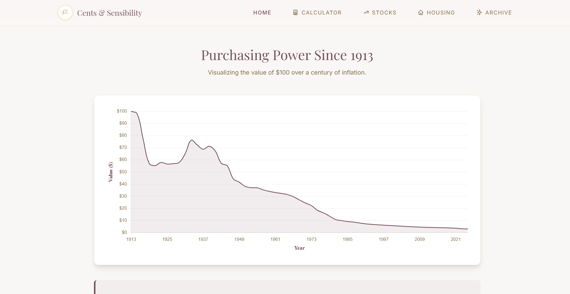 In the ancient world, the Library of Alexandria stood as humanity’s greatest collection of knowledge. It was a place where ideas, discoveries, and wisdom from across civilizations were gathered, preserved, and studied to guide the future. Cents & Sensibility brings that same philosophy into the financial world. Our platform collects financial data, historical trends like inflation, and market patterns, transforming them into a living, interactive archive of financial intelligence.