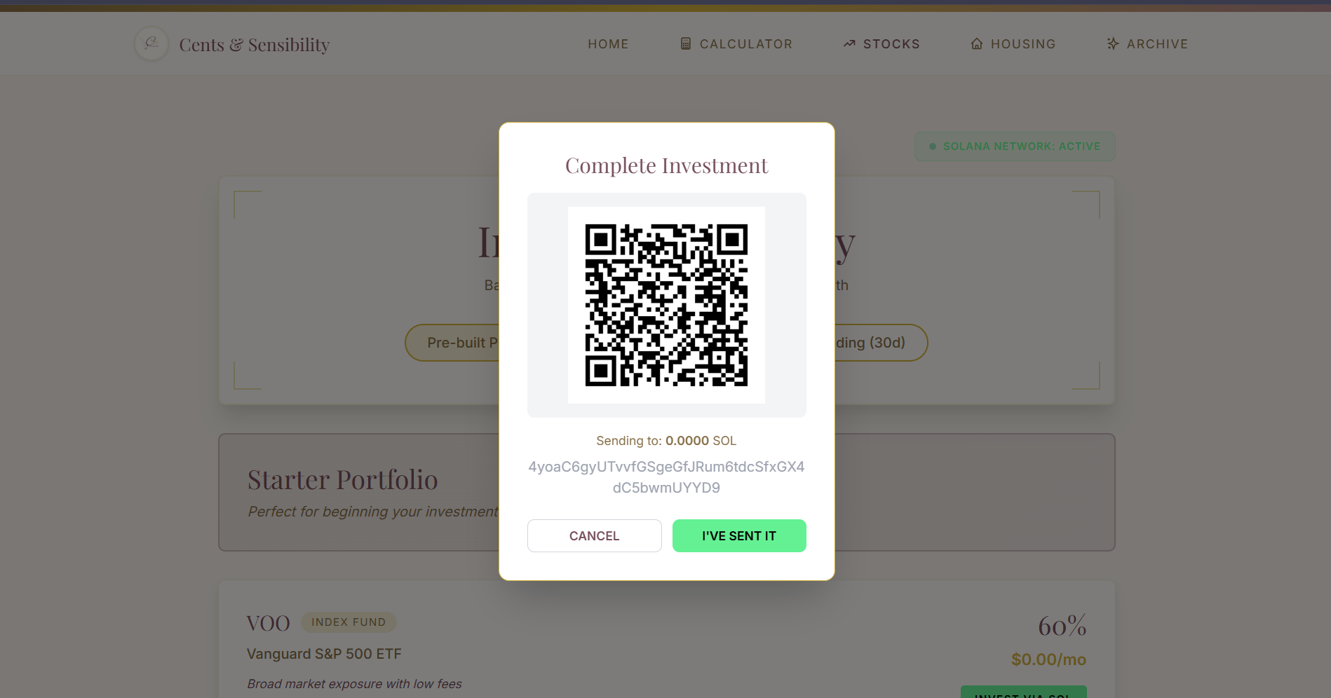 Investment Feature Complete an investment through Solana. Connecting to your personal wallet to your stocks and portfolio allows easy access