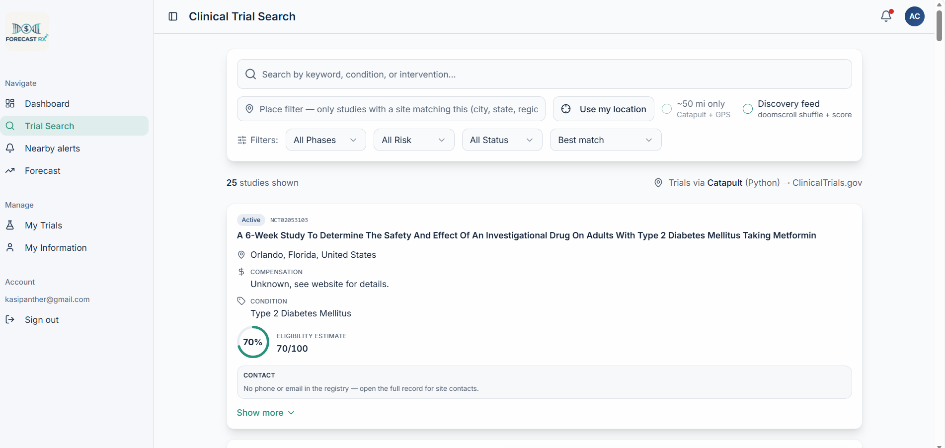 Using user profile data such as age, conditions, and locations, ForecastRX matches users to relevant clinical trials. Each result, retrieved from clinicaltrials.gov, includes the following: Match score, Eligibility breakdown, Trial compensation, Location and demographics, A description of the study.