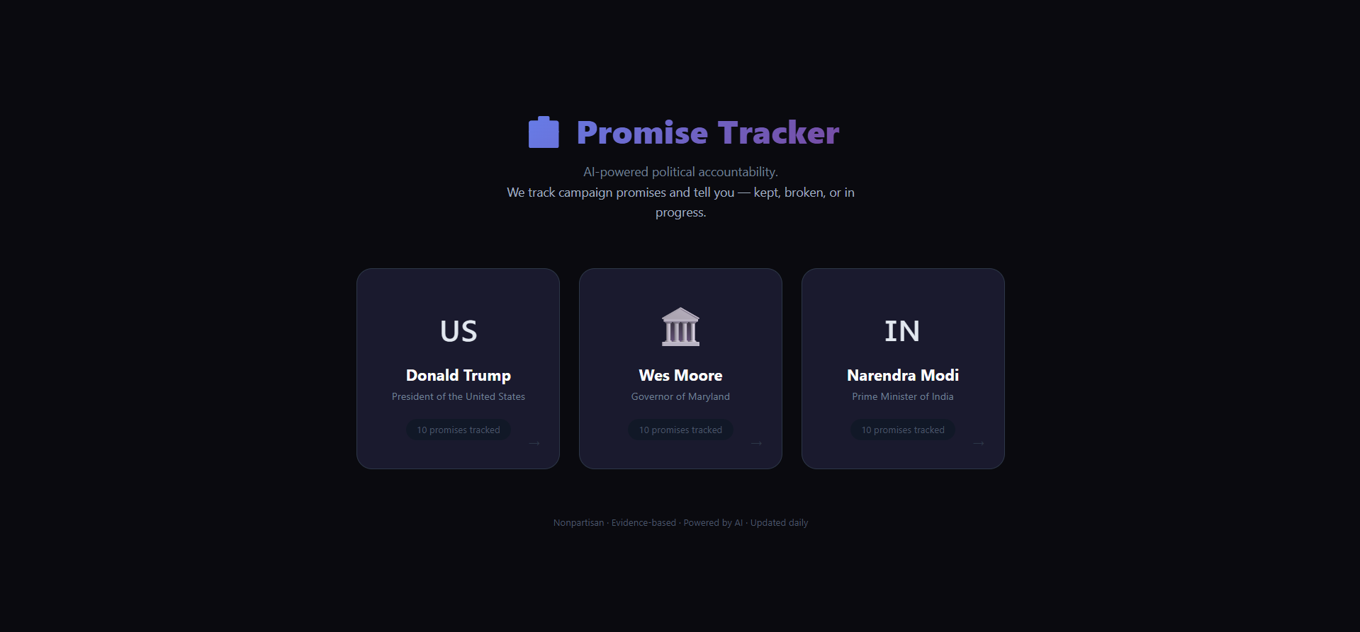 Promise Tracker scrapes real news daily from Google News, NPR, and Washington Post, then uses AI to analyze each campaign promise and return a nonpartisan verdict — kept, broken, in progress, partial, or reversed. Currently tracking Donald Trump, Maryland Governor Wes Moore, and India's PM Modi. Users can subscribe for daily email digests when statuses change.