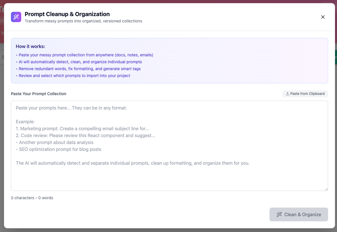 Promptasia is an elegant prompt management app that helps users organize, version, and optimize prompts across different AI applications. Users can tag prompts by project and platform, update or delete them, track prompt history, and maintain clean workflows. It makes prompt crafting efficient and strategic, especially when collaborating or iterating across use cases.