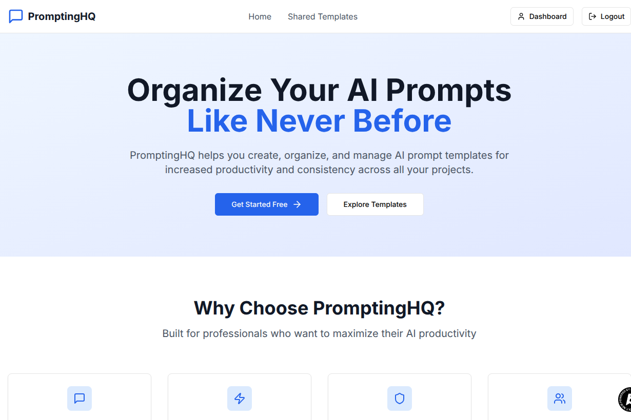 Many chat UIs provide the ability to have multiple conversations for related and even unrelated context but there often isn't a way to quickly reuse the same template without manually copying and pasting. This inspired creating PromptingHQ as a way to streamline this process and have templates that are readily available for use in a wide range of tasks.