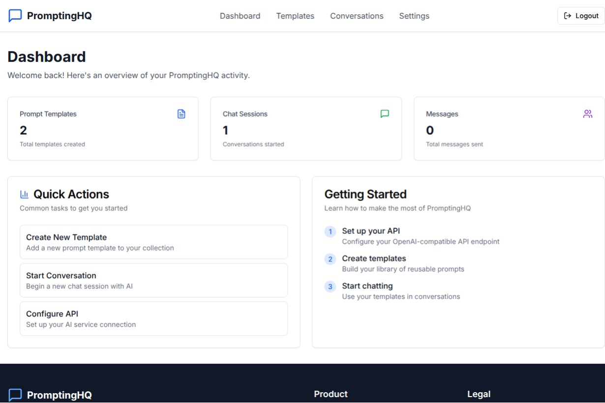 PromptingHQ provides a convenient way to organize prompt templates and quickly use them to start conversations for tasks that might be frequently repeated. It can be thought of as a way to parameterize prompts as would often be done when implementing in code but in a UI for anyone to use.