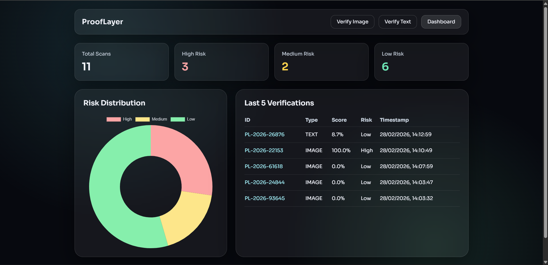 The backend is built with FastAPI and stores all results in SQLite. The critical design decision was making verification public and stateless — anyone with a Verification ID like PL-2026-00231 can hit: