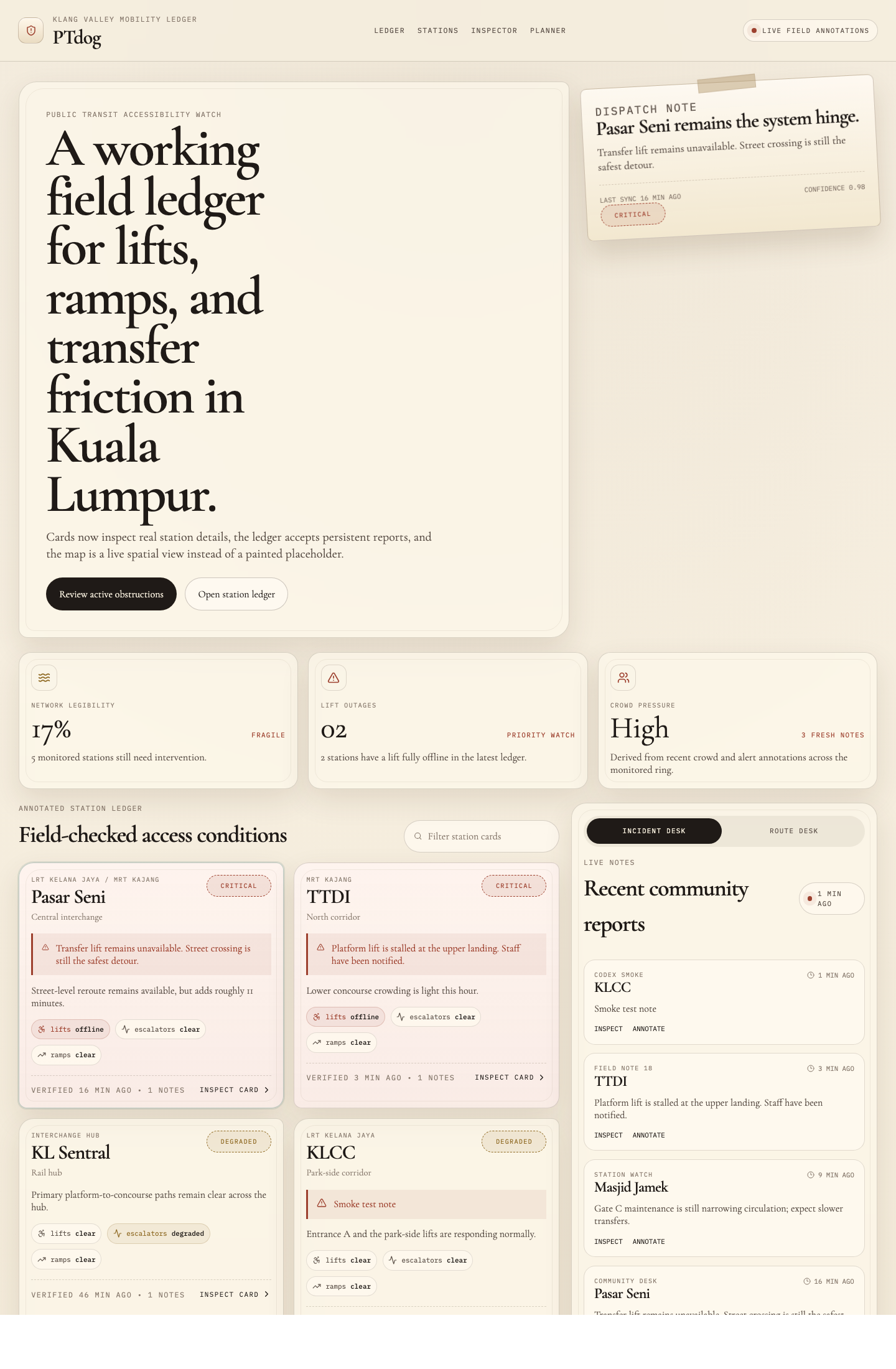 PTdog is a public transit accessibility watch for Klang Valley. It helps riders, carers, volunteers, and station teams see when a station is difficult to use, compare a faster route with a safer one, and share updates from the ground.
