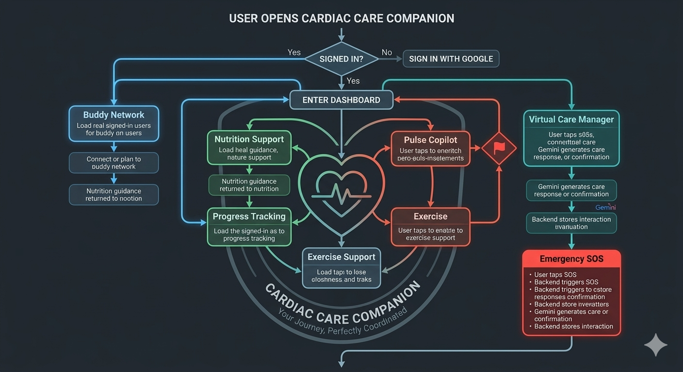 Pulse Copilot for daily emotional and recovery check-ins Buddy Network for accountability and peer connection Virtual Care Manager for care-team messaging and appointment scheduling Emergency SOS for rapid escalation and care-team alerts Nutrition Support for heart-healthy food guidance and better meal decisions Exercise Support for safer home workout guidance and confidence-building movement flows Progress Tracking to reflect recovery milestones and engagement How We Built It We built Pulse as a unified Next.js application with integrated frontend pages and backend API routes.