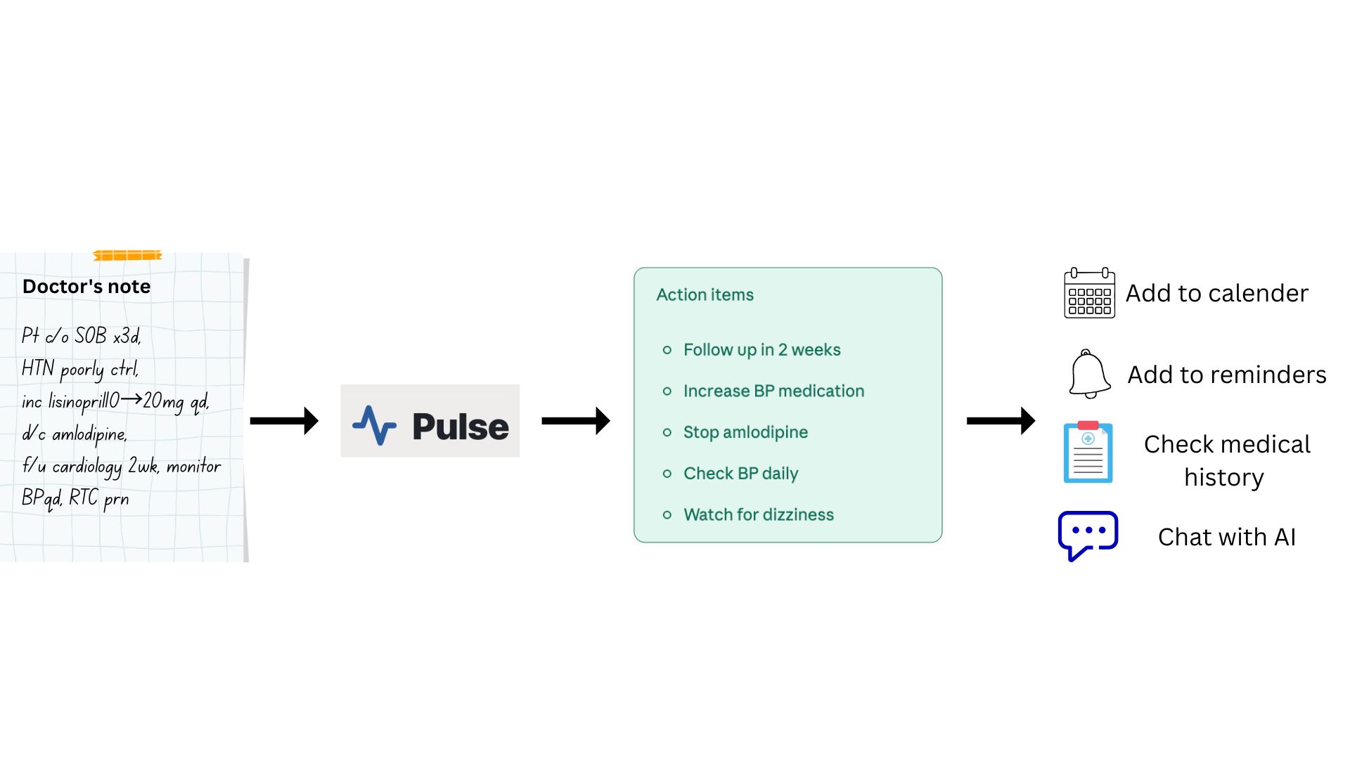 The Pulse app is a platform for managing health information by turning complex and cryptic notes written by your doctor during an appointment into a simplified form anyone can understand, with details such as tasks, follow-ups, vital signs, and other information extracted and compiled into something you can easily transfer to your calendar or list. Pulse compiles everything you need to manage your health or another person’s: medicines, diagnosis, appointments, personal tasks, and health history timeline.