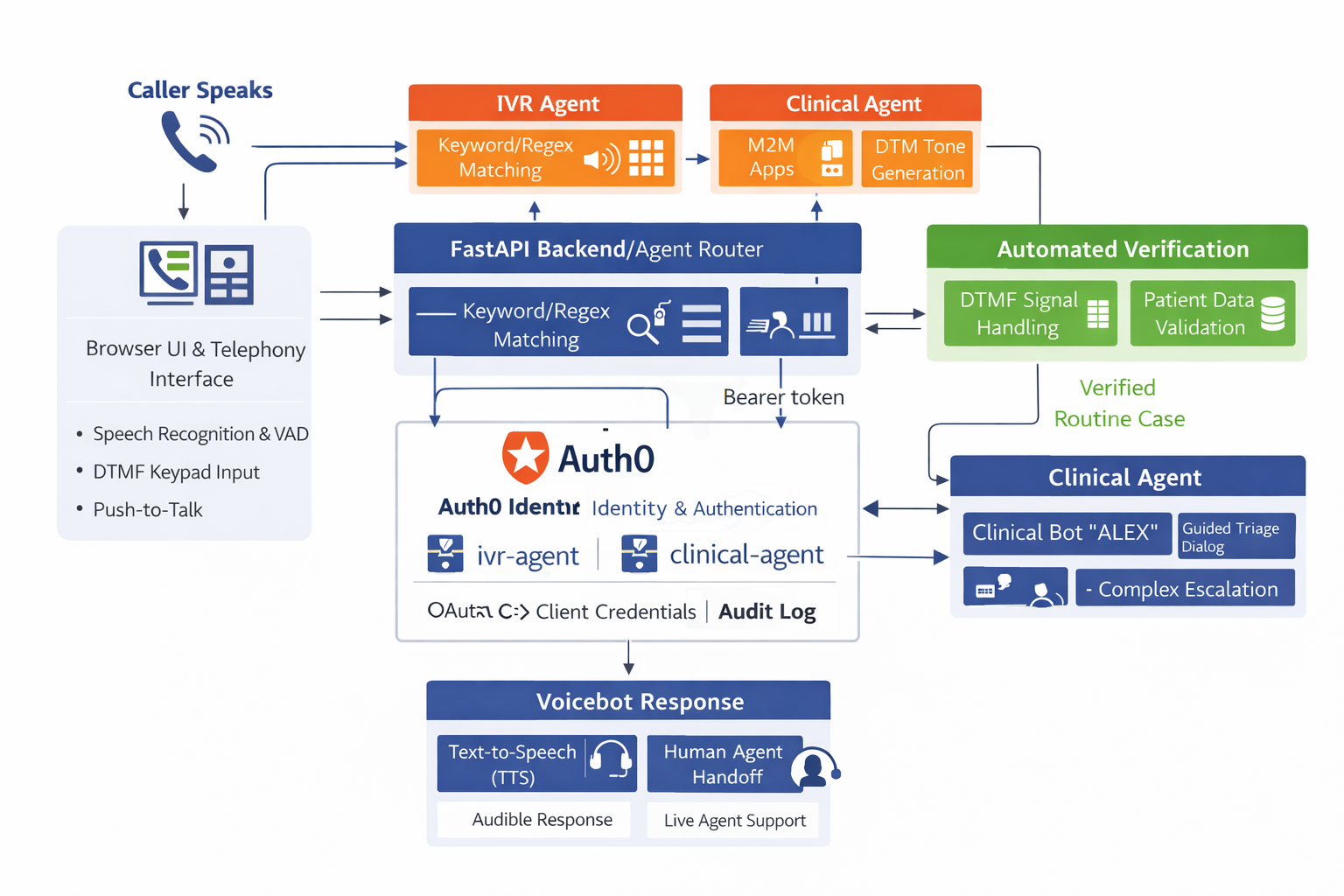 - Each AI agent (IVR agent or Clinical agent) authenticates using Auth0 Token Vault via OAuth 2.0, receiving short‑lived, scoped access tokens.