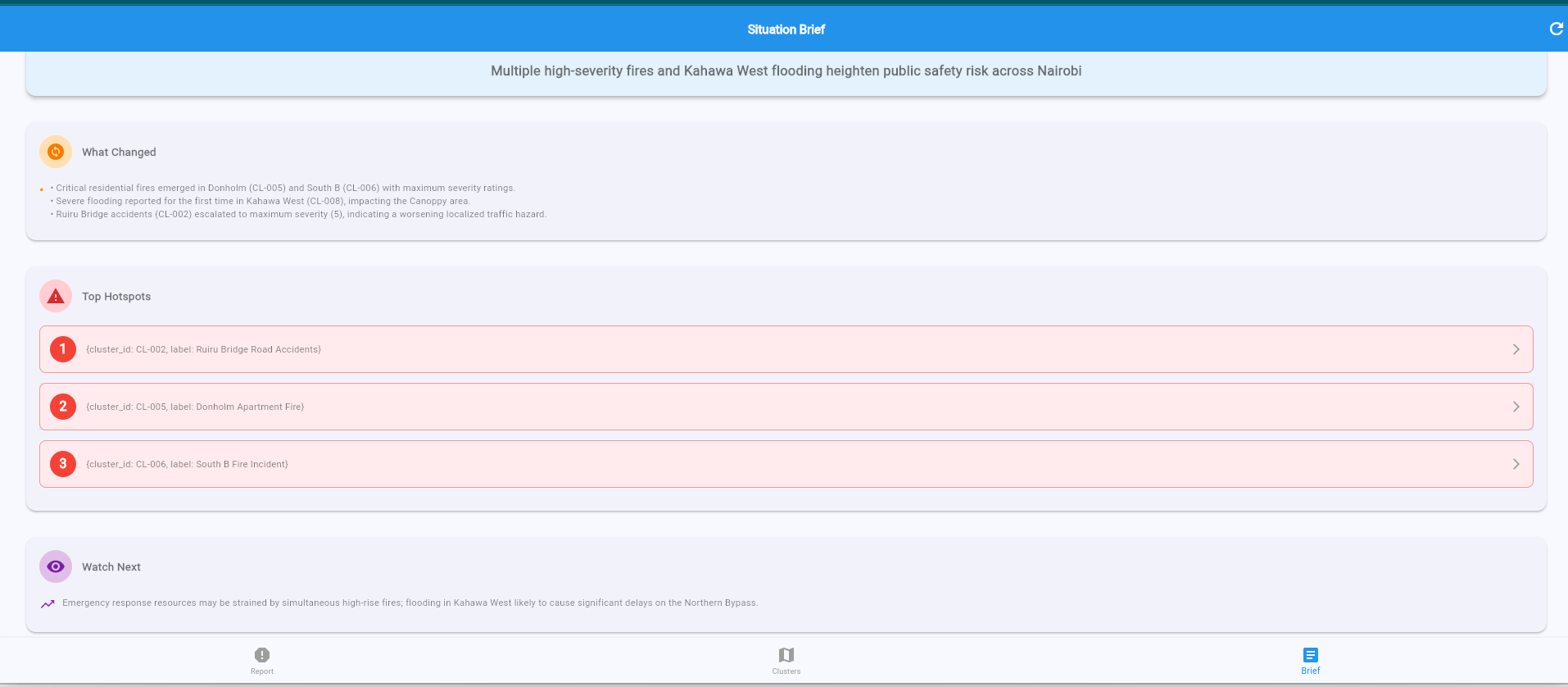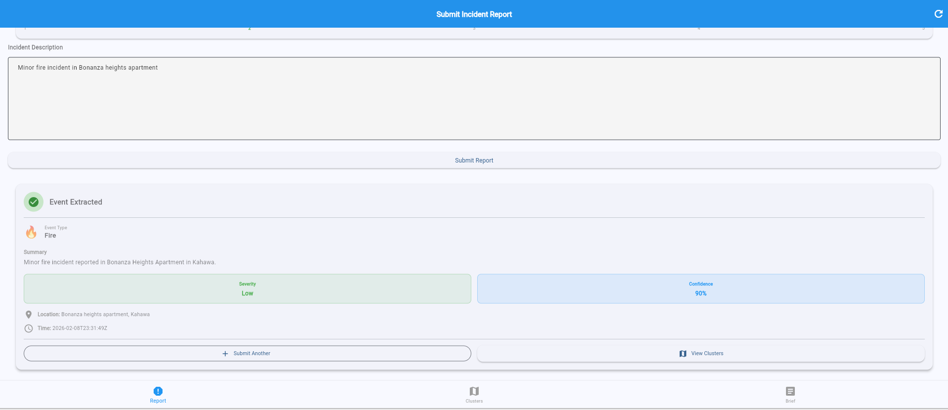 A user submits a short description or image of an incident. Gemini 3 extracts the event type, location hints, severity, and confidence. Events are grouped into live clusters when patterns appear. The system generates short public safety briefs that show what is happening now, what changed, and where attention is needed.