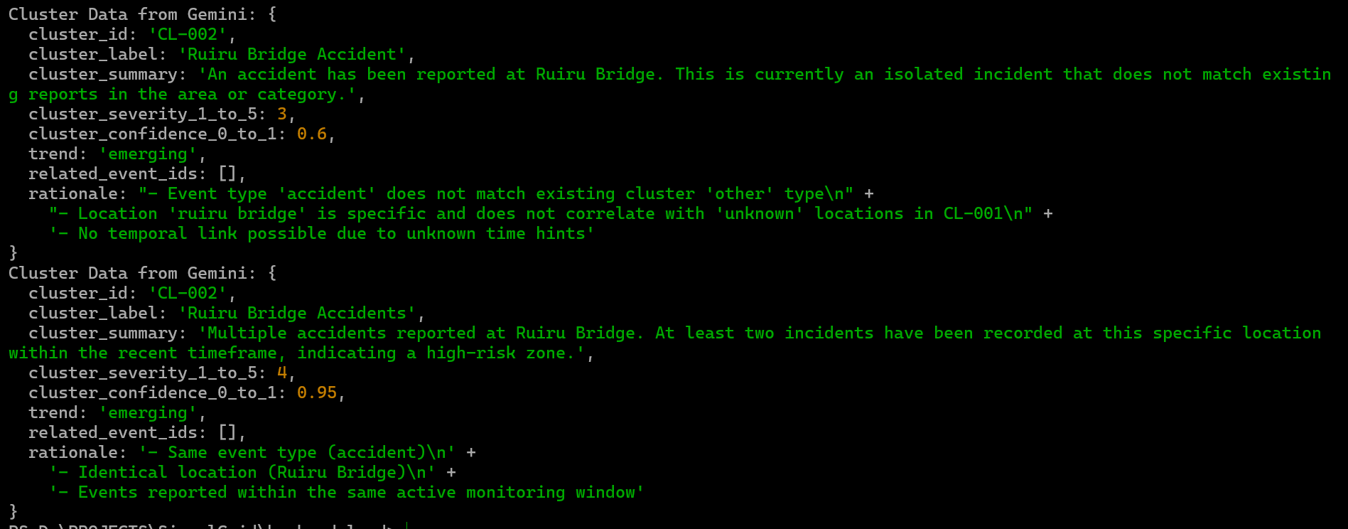 A second Gemini flow clusters similar events by location, time, and type. Another Gemini prompt generates concise situation briefs from active clusters.