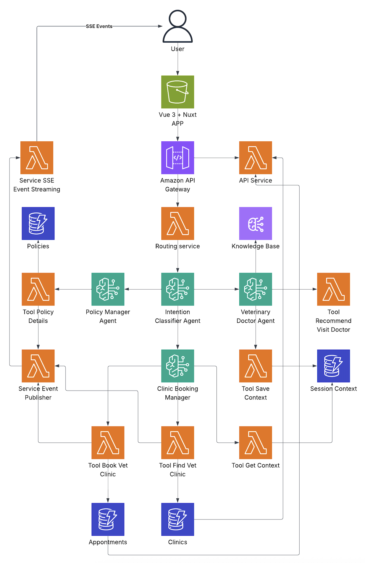 agent-intention-classifier- Routes queries to specialized agentsagent-policy-manager- Handles insurance policy queriesagent-vet-doctor- Provides veterinary consultations with RAGagent-booking-manager- Manages clinic search and appointments