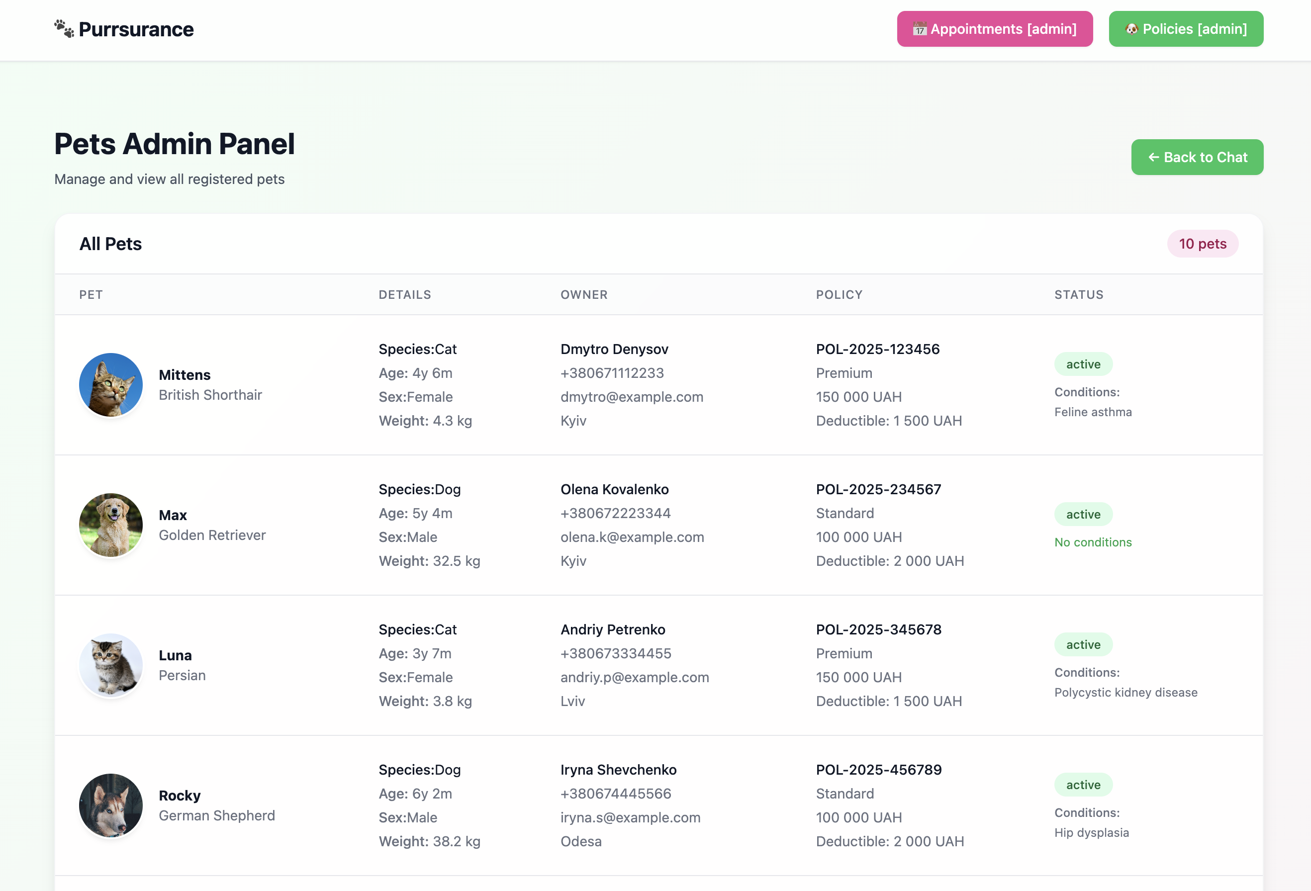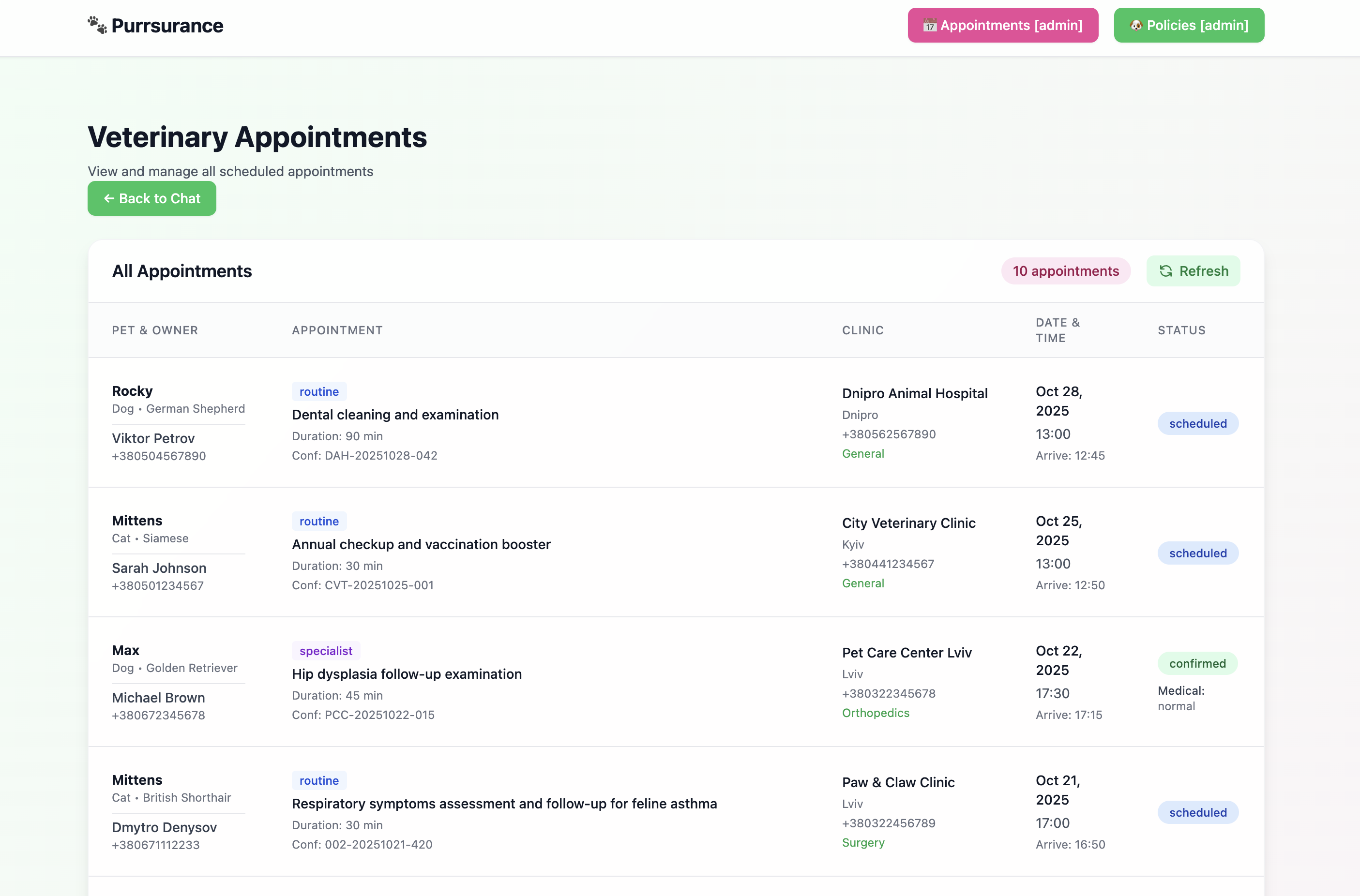 Purrsurance solves these problems by providing an intelligent, conversational assistant that can handle insurance inquiries, provide preliminary veterinary assessments, and facilitate appointment booking - all in one place.