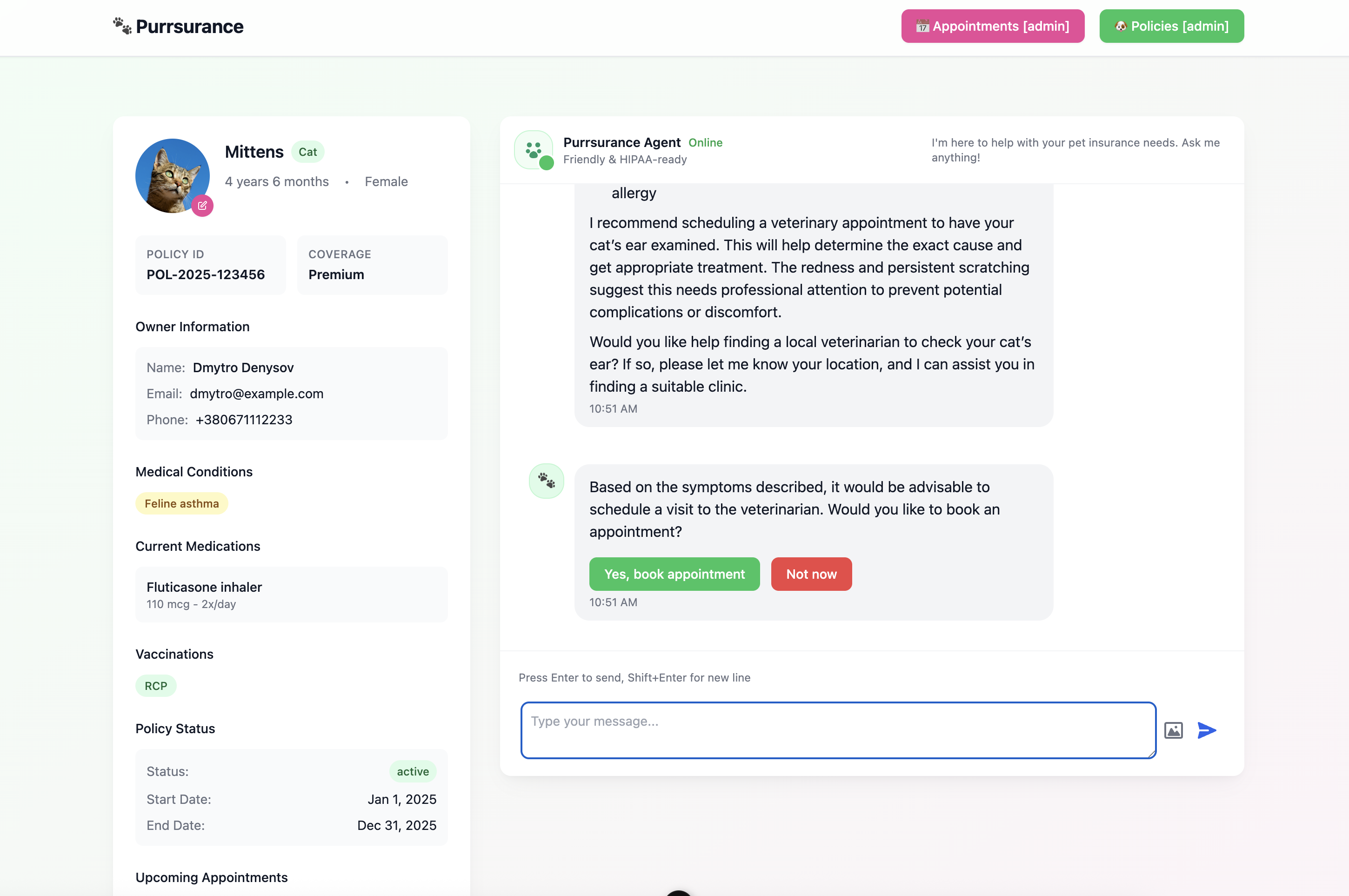 Purrsurance is an intelligent pet insurance management platform that leverages AI agents powered by AWS Bedrock to provide instant policy information, veterinary consultations, and appointment booking through a conversational interface. The platform combines insurance management with AI-driven pet healthcare assistance to deliver a seamless user experience for pet owners.