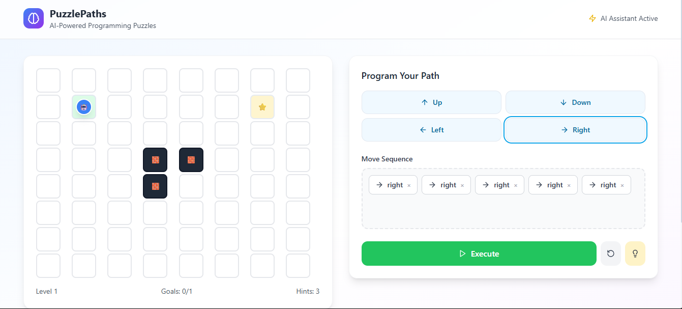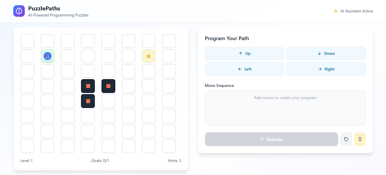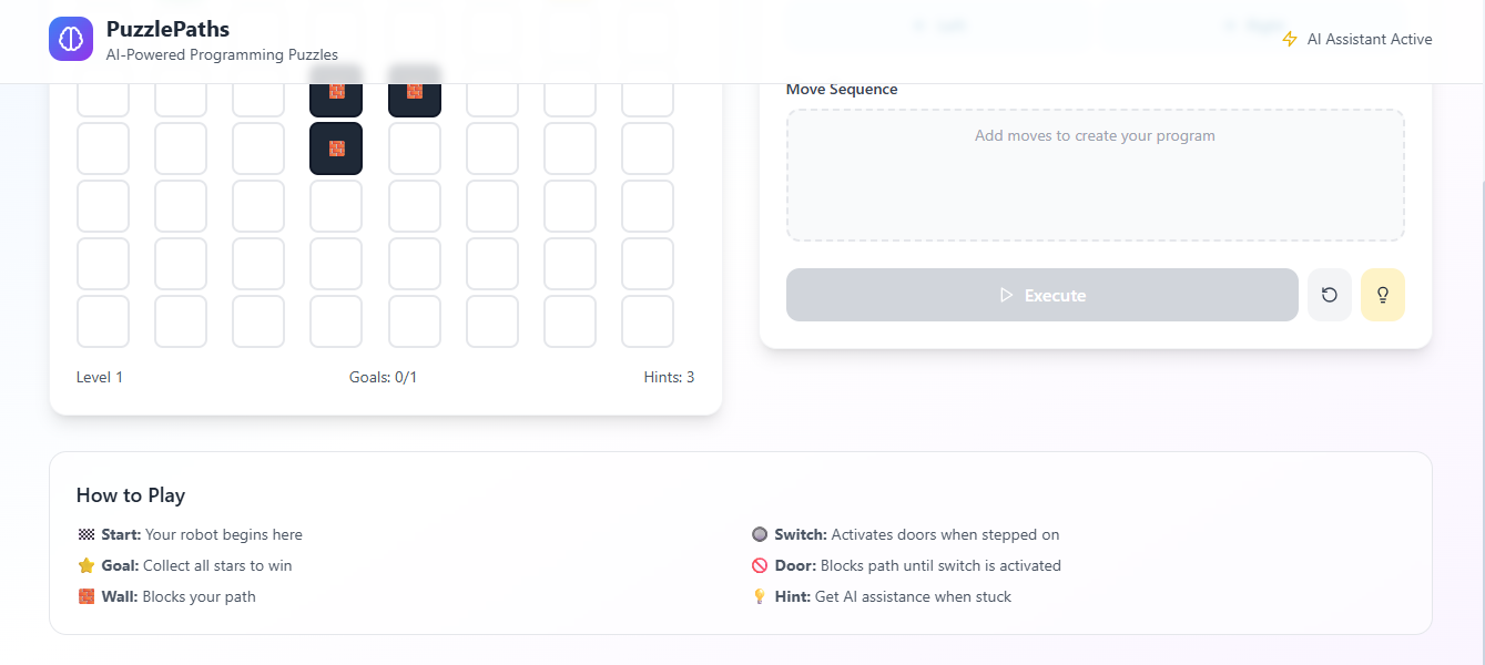 🧩 What it does PuzzlePaths is a web game where you program a path through a maze using logic moves. You get a start point, a goal, and a few simple commands (like move, turn, or if-then). Your task: solve the puzzle using the fewest moves possible. It also includes smart AI hints and adapts to your skill level.