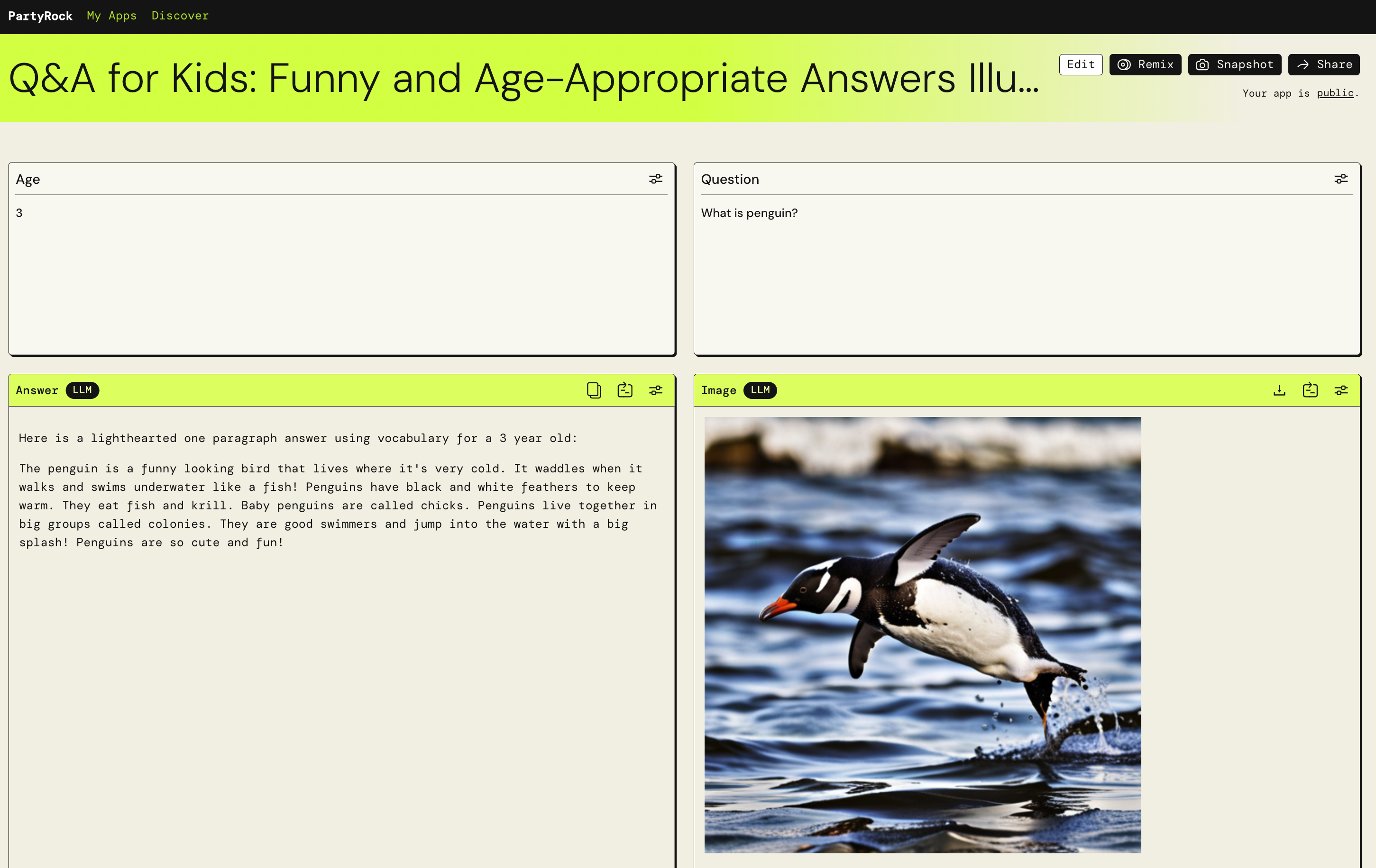 It accepts age and questions as inputs and generates funny answer using age-appropriate words along with an image describing the answer.