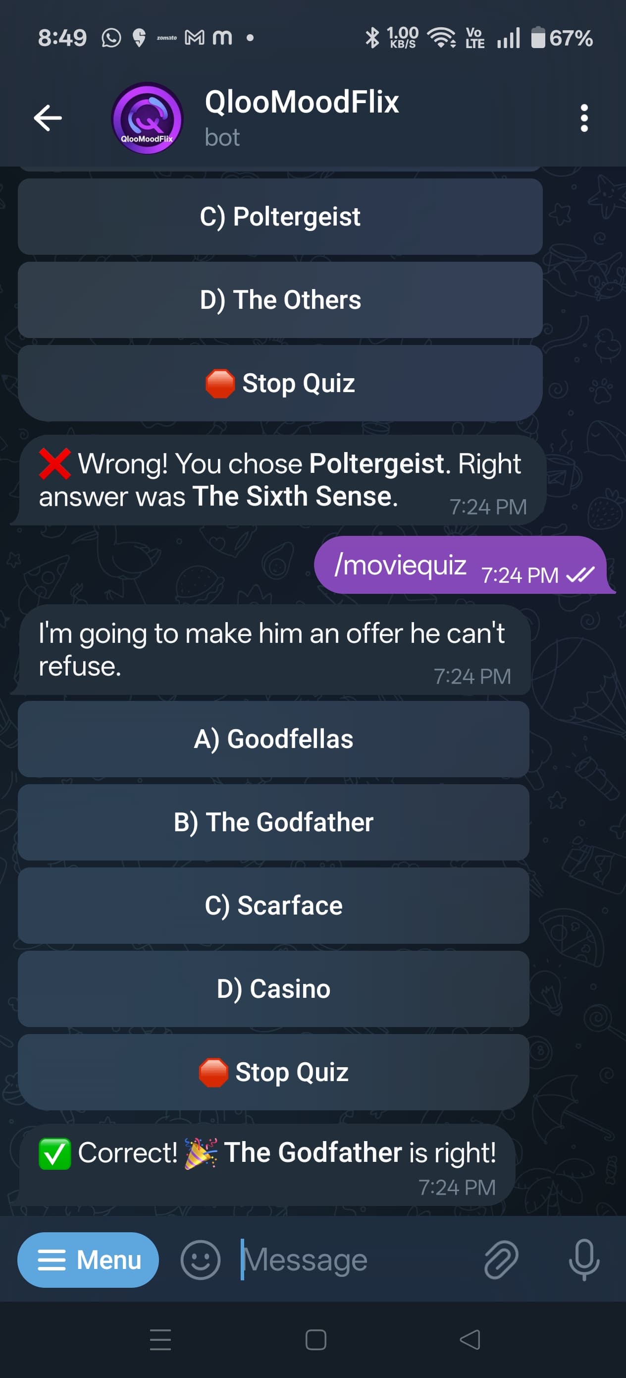 Integrated the /moviequizz custom Telegram command, which triggers the Qloo Insights API to fetch movie data. The results are then passed to an LLM to generate interactive quiz-style questions based on Qloo's insights