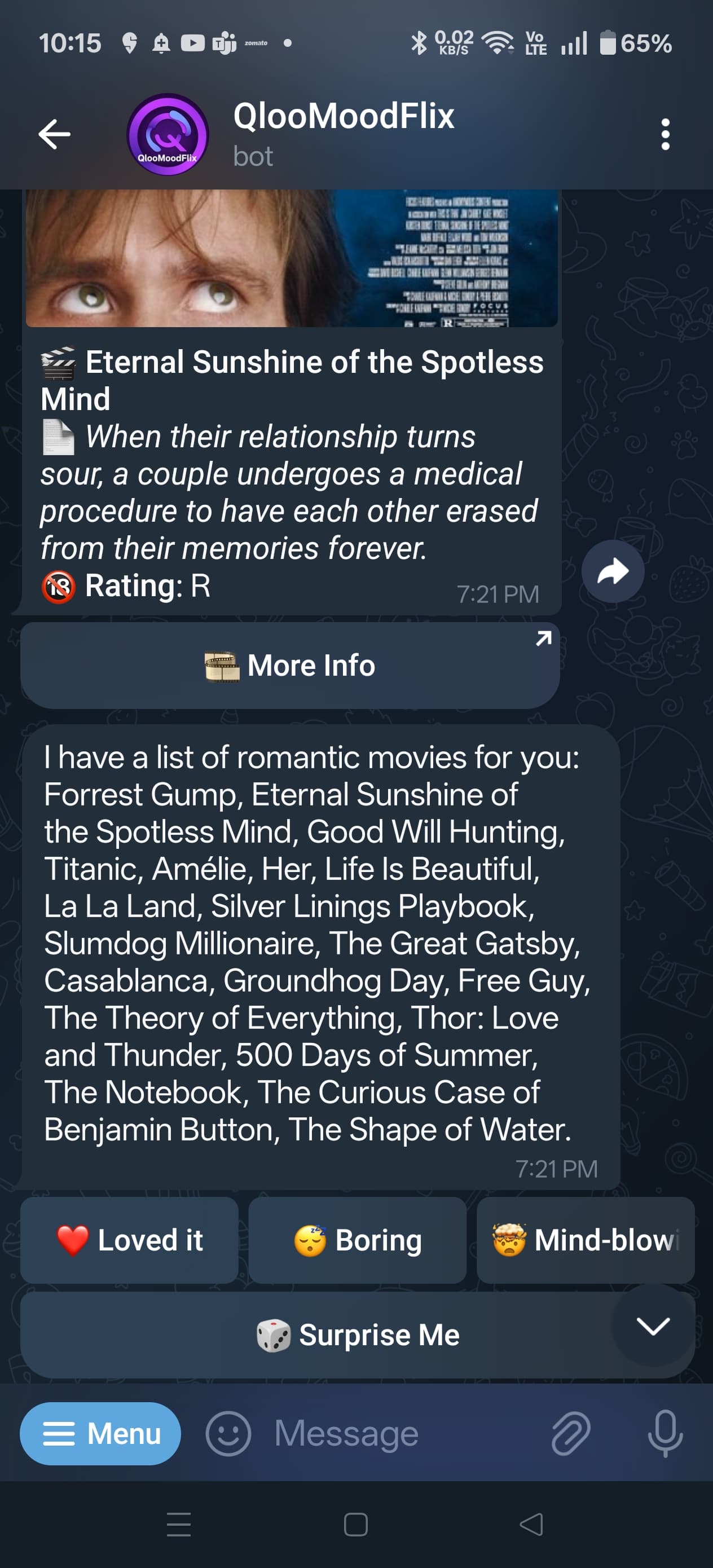 QlooMoodFlix is an intelligent Telegram bot that provides hyper-personalized movie recommendations based on a user's mood. A user can simply type a natural language message like, "I've had a stressful day and want to watch something heartwarming," and the bot delivers a curated list of relevant films. It bypasses generic genre filters by understanding the user's specific feeling, finding a perfect "seed" movie to match it, and then using Qloo's Taste AI™ to discover other movies with a similar "cultural DNA."