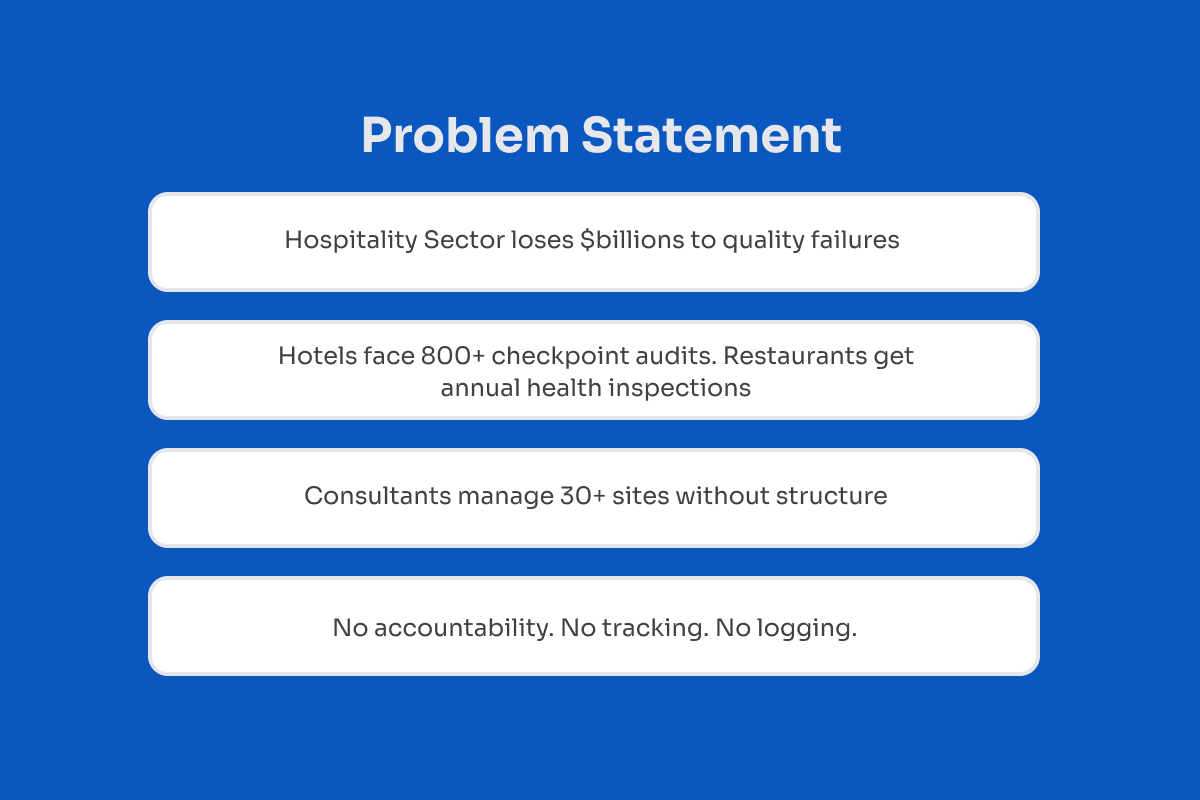 The hospitality industry generates $4.7 trillion globally, yet quality management remains stuck in the spreadsheet era. Hotels track audits in Excel. Issues get assigned via email. Follow-ups happen through WhatsApp groups. A single management company with 30 properties conducted 20,000 inspections in one year, all tracked manually across disconnected systems.