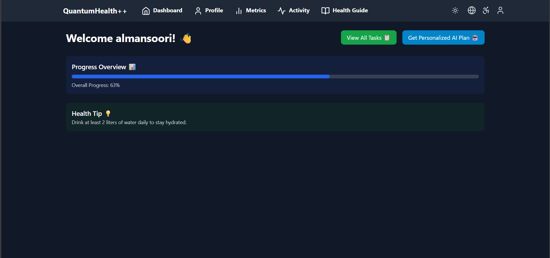 QuantumHealth++ is an AI-powered healthcare platform that provides personalized health insights in real time. It collects and analyzes wearable data to generate a dynamic health score, reflecting a user’s current condition and trends over time.