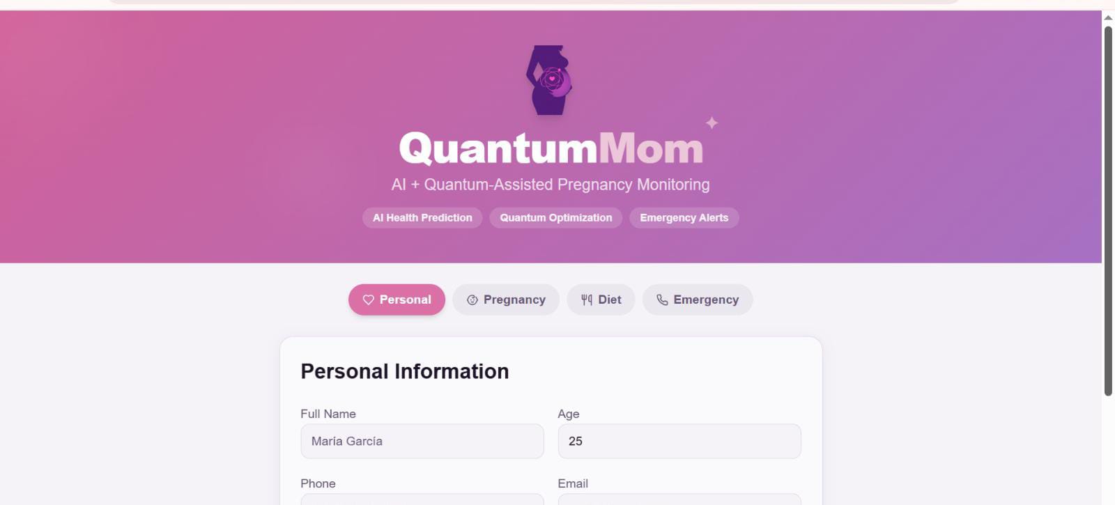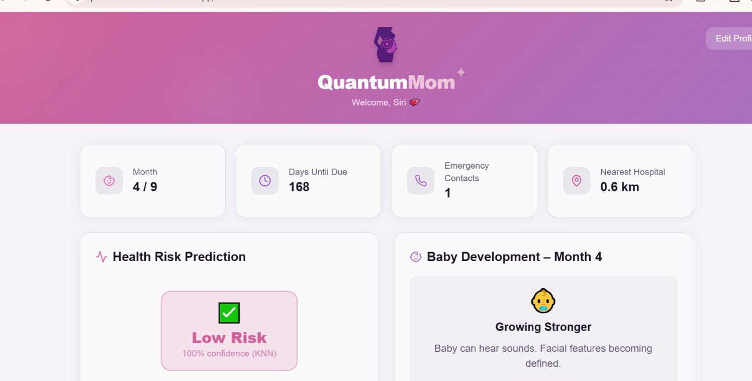 QuantumMom is a web-based maternal healthcare application designed to support pregnant women throughout their pregnancy journey.