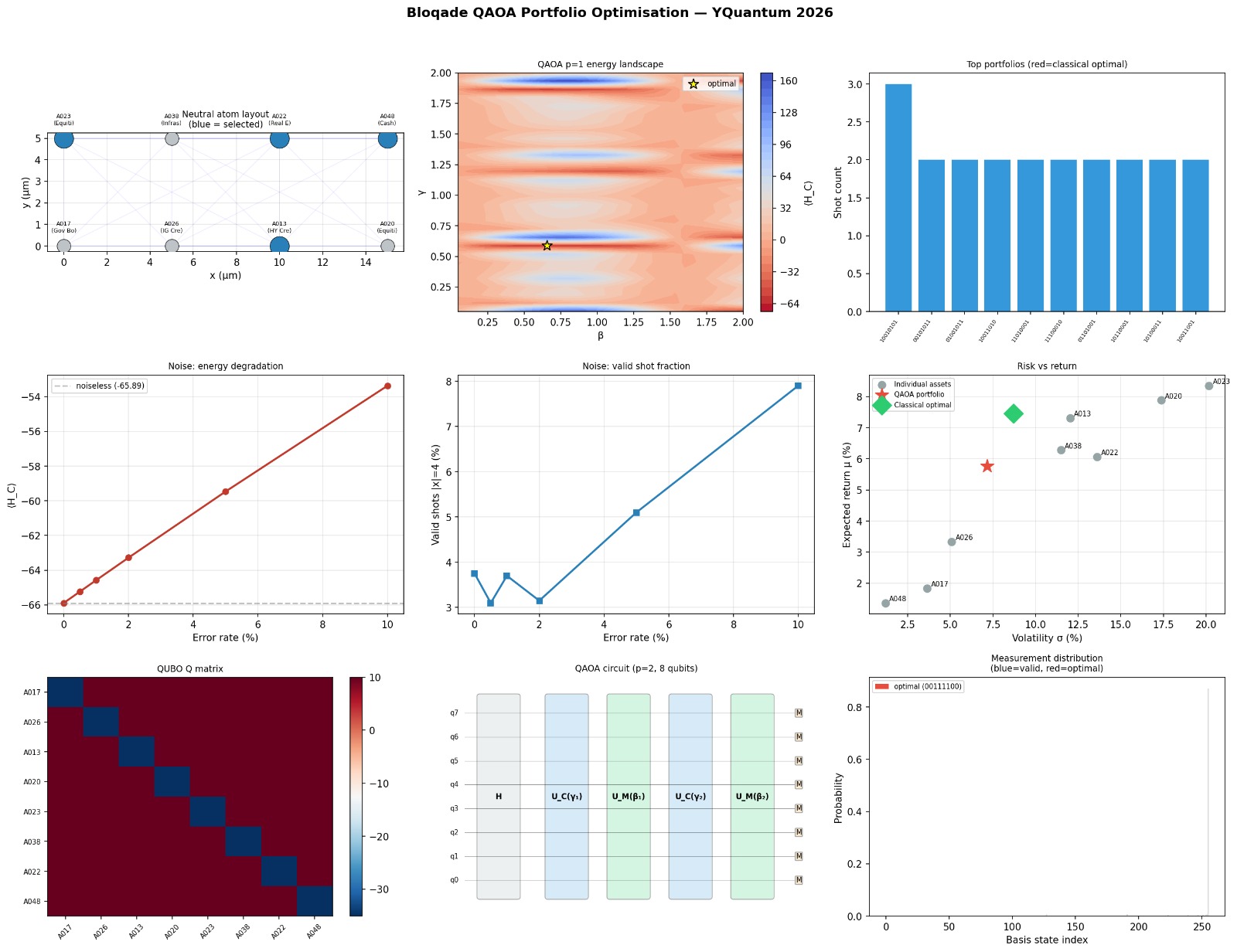 How we built it We started from zero and learned the basics step by step: what qubits are, what QUBO means, and why optimization problems can be mapped into quantum circuits. First, we built a classical baseline in Python so we could understand the finance side of the problem and verify that our results made sense. Then we reduced the full dataset to an 8-asset version, encoded it as a binary optimization problem, and built a QAOA circuit for the neutral-atom hardware model. Along the way, we relied on a lot of debugging, documentation reading, and simplifying our scope so we could get a working MVP instead of getting stuck trying to do everything at once.