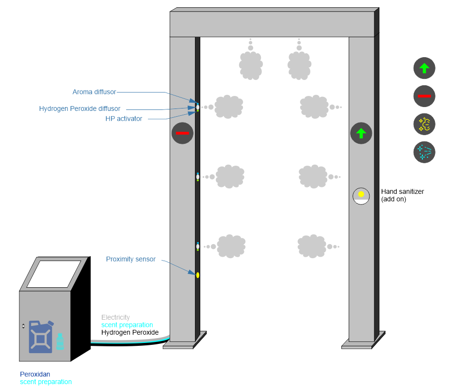 Second solution will be prepared to disinfect hands, people, shopping troleys, even cars and busses at public spots - quickly and automaticaly. With activated Hydrogen Peroxide it will be faster, less invasive and even more succesful than usual Hidrogen Peroxide solution.