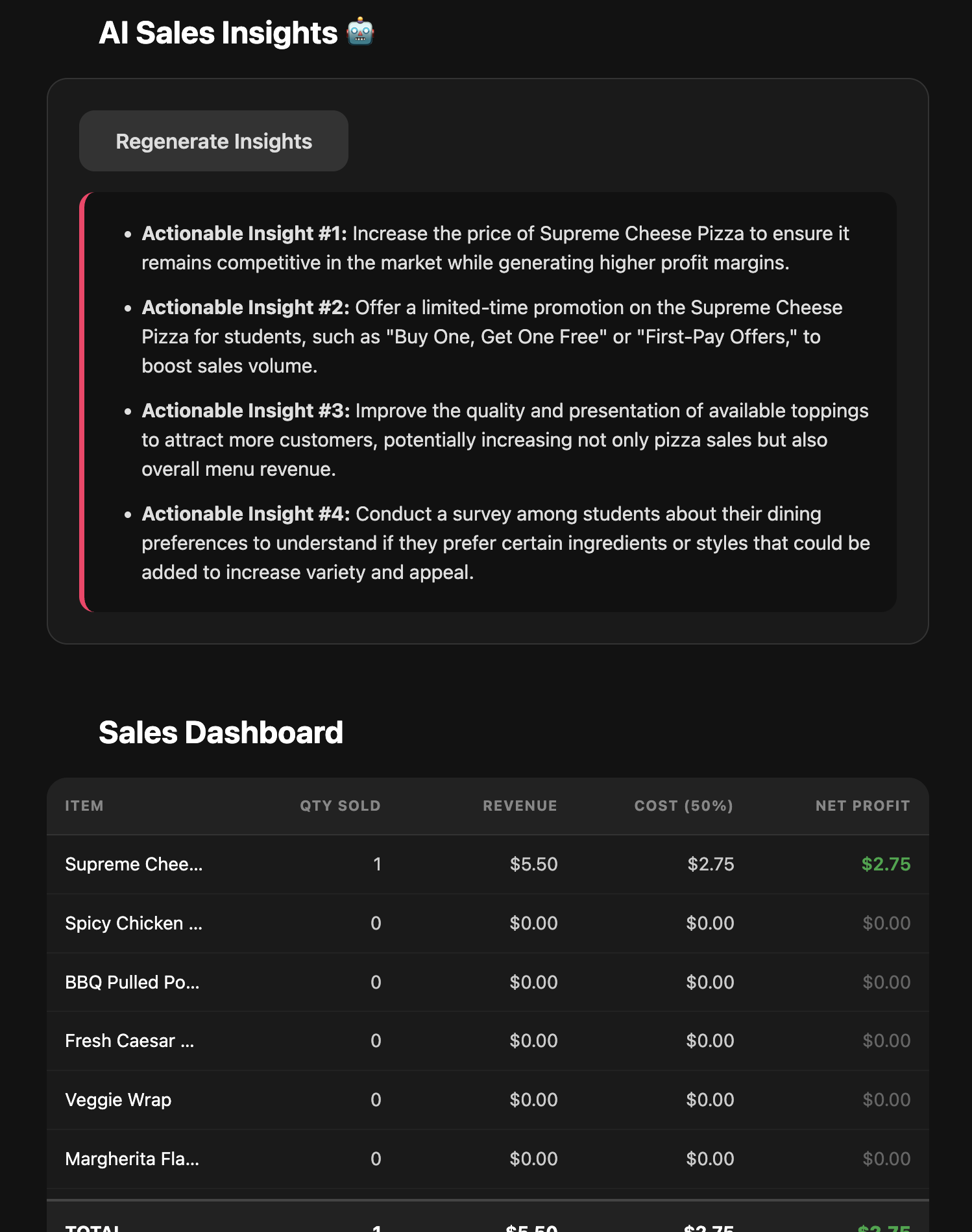 Develop a database for expansion as our solution is a prototype. But everything works really well, and if needed we could expand so that there is more customizability for the cafeteria workers.